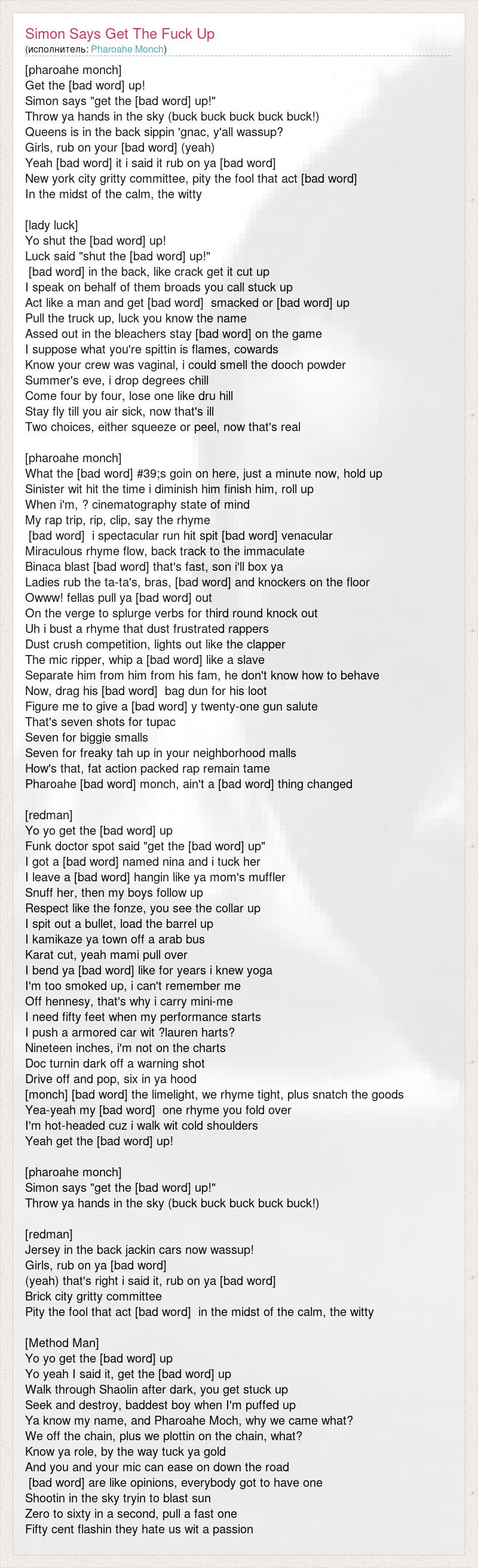 [pharoahe monch] Get the [bad word] up! Simon says "get the [bad word] up!" Throw ya hands in the sky (buck buck buck buck buck!) Queens is in the back sippin 'gnac, y'all wassup? Girls, rub on your [bad word] (yeah) Yeah [bad word] it i said it rub on ya [bad word] New york city gritty committee, pity the fool that act [bad word] In the midst of the calm, the witty [lady luck] Yo shut the [bad word] up! Luck said "shut the [bad word] up!" [bad word] in the back, like crack get it cut up I speak on behalf of them broads you call stuck up Act like a man and get [bad word] smacked or [bad word] up Pull the truck up, luck you know the name Assed out in the bleachers stay [bad word] on the game I suppose what you're spittin is flames, cowards Know your crew was vaginal, i could smell the dooch powder Summer's eve, i drop degrees chill Come four by four, lose one like dru hill Stay fly till you air sick, now that's ill Two choices, either squeeze or peel, now that's real [pharoahe monch] What the [bad word] #39;s goin on here, just a minute now, hold up Sinister wit hit the time i diminish him finish him, roll up When i'm, ? cinematography state of mind My rap trip, rip, clip, say the rhyme [bad word] i spectacular run hit spit [bad word] venacular Miraculous rhyme flow, back track to the immaculate Binaca blast [bad word] that's fast, son i'll box ya Ladies rub the ta-ta's, bras, [bad word] and knockers on the floor Owww! fellas pull ya [bad word] out On the verge to splurge verbs for third round knock out Uh i bust a rhyme that dust frustrated rappers Dust crush competition, lights out like the clapper The mic ripper, whip a [bad word] like a slave Separate him from him from his fam, he don't know how to behave Now, drag his [bad word] bag dun for his loot Figure me to give a [bad word] y twenty-one gun salute That's seven shots for tupac Seven for biggie smalls Seven for freaky tah up in your neighborhood malls How's that, fat action packed rap remain tame Pharoahe [bad word] monch, ain't a [bad word] thing changed [redman] Yo yo get the [bad word] up Funk doctor spot said "get the [bad word] up" I got a [bad word] named nina and i tuck her I leave a [bad word] hangin like ya mom's muffler Snuff her, then my boys follow up Respect like the fonze, you see the collar up I spit out a bullet, load the barrel up I kamikaze ya town off a arab bus Karat cut, yeah mami pull over I bend ya [bad word] like for years i knew yoga I'm too smoked up, i can't remember me Off hennesy, that's why i carry mini-me I need fifty feet when my performance starts I push a armored car wit ?lauren harts? Nineteen inches, i'm not on the charts Doc turnin dark off a warning shot Drive off and pop, six in ya hood [monch] [bad word] the limelight, we rhyme tight, plus snatch the goods Yea-yeah my [bad word] one rhyme you fold over I'm hot-headed cuz i walk wit cold shoulders Yeah get the [bad word] up! [pharoahe monch] Simon says "get the [bad word] up!" Throw ya hands in the sky (buck buck buck buck buck!) [redman] Jersey in the back jackin cars now wassup! Girls, rub on ya [bad word] (yeah) that's right i said it, rub on ya [bad word] Brick city gritty committee Pity the fool that act [bad word] in the midst of the calm, the witty [Method Man] Yo yo get the [bad word] up Yo yeah I said it, get the [bad word] up Walk through Shaolin after dark, you get stuck up Seek and destroy, baddest boy when I'm puffed up Ya know my name, and Pharoahe Moch, why we came what? We off the chain, plus we plottin on the chain, what? Know ya role, by the way tuck ya gold And you and your mic can ease on down the road [bad word] are like opinions, everybody got to have one Shootin in the sky tryin to blast sun Zero to sixty in a second, pull a fast one Fifty cent flashin they hate us wit a passion
