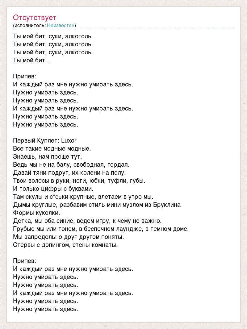 Ты мой бит, суки, алкоголь. Ты мой бит, суки, алкоголь. Ты мой бит, суки, алкоголь. Ты мой бит... Припев: И каждый раз мне нужно умирать здесь. Нужно умирать здесь. Нужно умирать здесь. И каждый раз мне нужно умирать здесь. Нужно умирать здесь. Нужно умирать здесь. Первый Куплет: Luxor Все такие модные модные. Знаешь, нам проще тут. Ведь мы не на балу, свободная, гордая. Давай тяни подруг, их колени на полу. Твои волосы в руки, ноги, юбки, туфли, губы. И только цифры с буквами. Там скулы и с*ськи крупные, влетаем в утро мы. Дымы круглые, разбавим стиль мини музлом из Бруклина Формы куколки. Детка, мы оба синие, ведем игру, к чему не важно. Грубые мы или тонем, в беспечном лаундже, в темном доме. Мы запредельно друг другом поняты. Стервы с допингом, стены комнаты. Припев: И каждый раз мне нужно умирать здесь. Нужно умирать здесь. Нужно умирать здесь. И каждый раз мне нужно умирать здесь. Нужно умирать здесь. Нужно умирать здесь.
