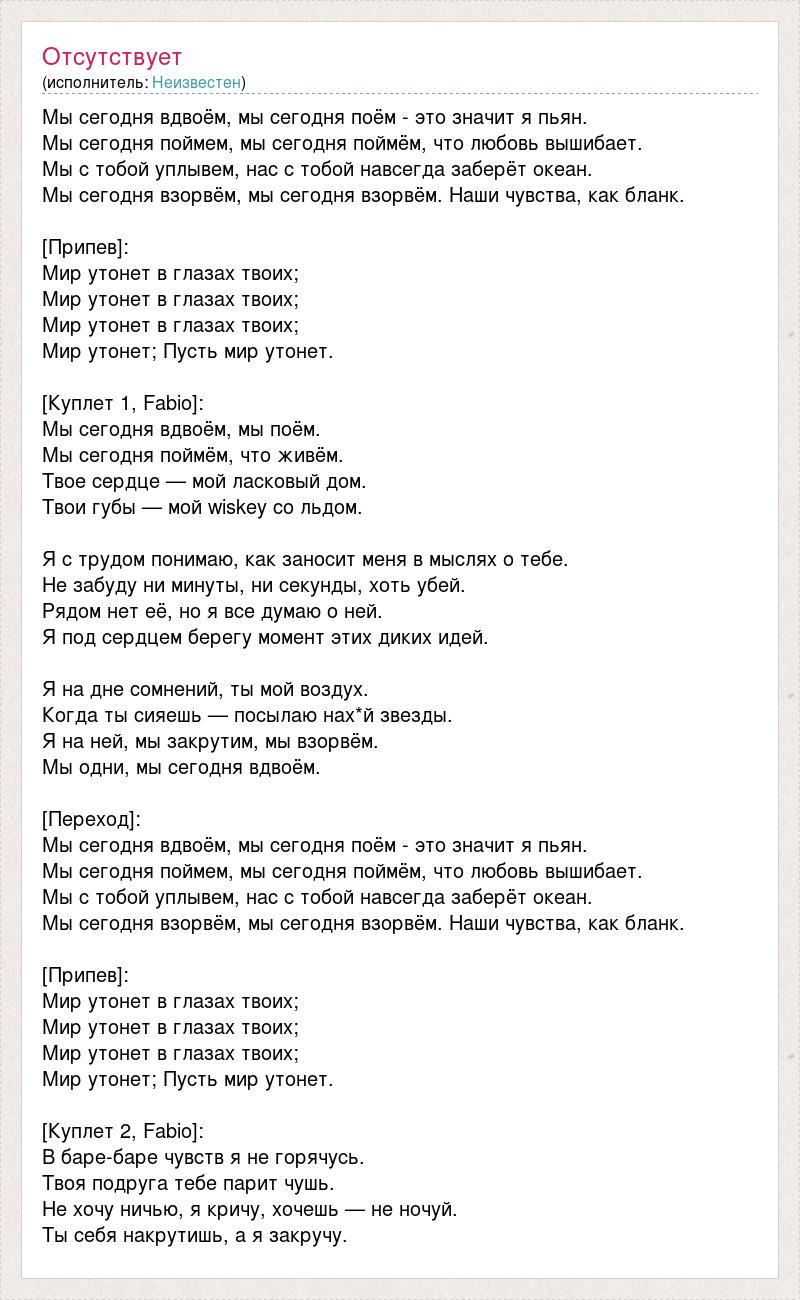 Мы сегодня вдвоём, мы сегодня поём - это значит я пьян. Мы сегодня поймем, мы сегодня поймём, что любовь вышибает. Мы с тобой уплывем, нас с тобой навсегда заберёт океан. Мы сегодня взорвём, мы сегодня взорвём. Наши чувства, как бланк. [Припев]: Мир утонет в глазах твоих; Мир утонет в глазах твоих; Мир утонет в глазах твоих; Мир утонет; Пусть мир утонет. [Куплет 1, Fabio]: Мы сегодня вдвоём, мы поём. Мы сегодня поймём, что живём. Твое сердце — мой ласковый дом. Твои губы — мой wiskey со льдом. Я с трудом понимаю, как заносит меня в мыслях о тебе. Не забуду ни минуты, ни секунды, хоть убей. Рядом нет её, но я все думаю о ней. Я под сердцем берегу момент этих диких идей. Я на дне сомнений, ты мой воздух. Когда ты сияешь — посылаю нах*й звезды. Я на ней, мы закрутим, мы взорвём. Мы одни, мы сегодня вдвоём. [Переход]: Мы сегодня вдвоём, мы сегодня поём - это значит я пьян. Мы сегодня поймем, мы сегодня поймём, что любовь вышибает. Мы с тобой уплывем, нас с тобой навсегда заберёт океан. Мы сегодня взорвём, мы сегодня взорвём. Наши чувства, как бланк. [Припев]: Мир утонет в глазах твоих; Мир утонет в глазах твоих; Мир утонет в глазах твоих; Мир утонет; Пусть мир утонет. [Куплет 2, Fabio]: В баре-баре чувств я не горячусь. Твоя подруга тебе парит чушь. Не хочу ничью, я кричу, хочешь — не ночуй. Ты себя накрутишь, а я закручу.