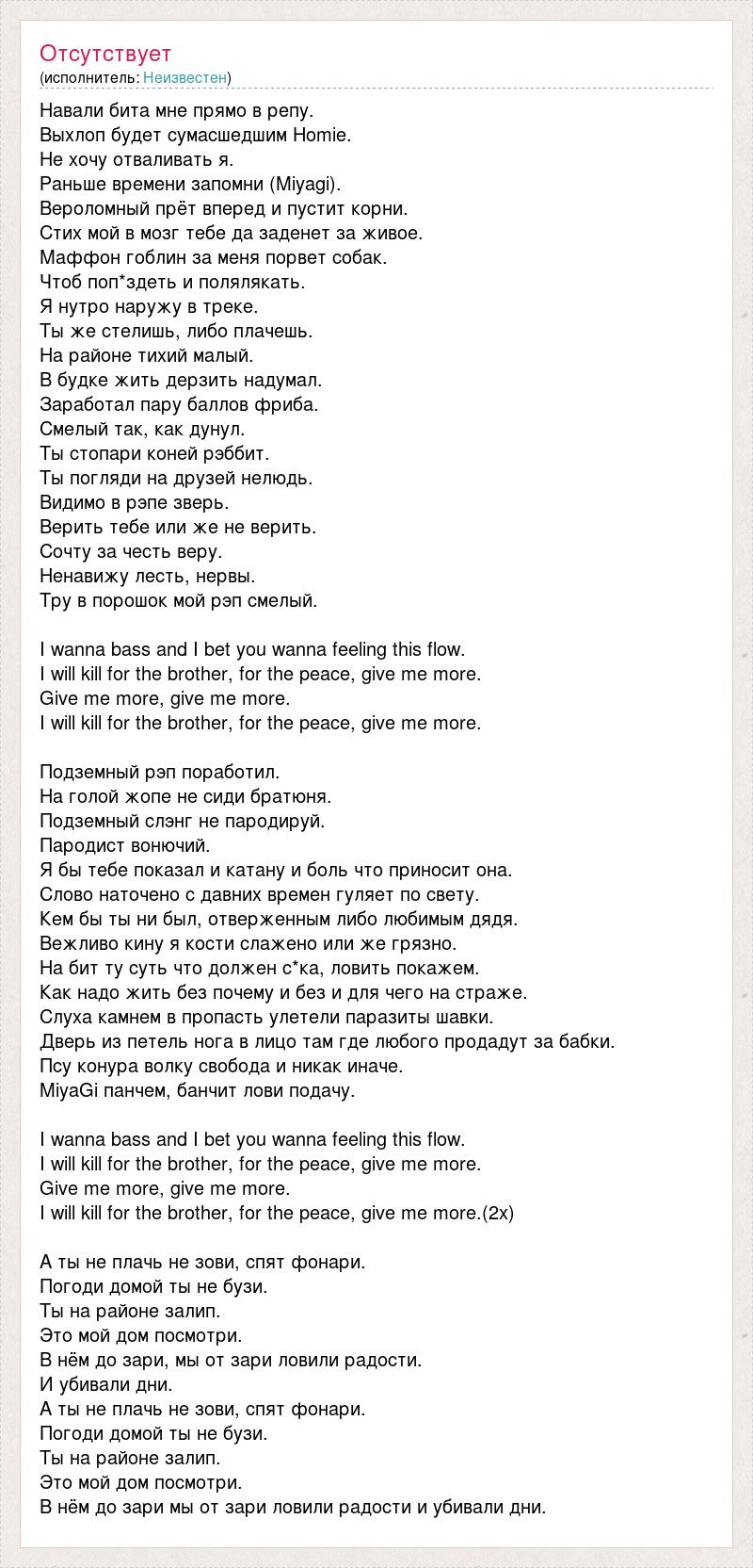 Навали бита мне прямо в репу. Выхлоп будет сумасшедшим Homie. Не хочу отваливать я. Раньше времени запомни (Miyagi). Вероломный прёт вперед и пустит корни. Стих мой в мозг тебе да заденет за живое. Маффон гоблин за меня порвет собак. Чтоб поп*здеть и полялякать. Я нутро наружу в треке. Ты же стелишь, либо плачешь. На районе тихий малый. В будке жить дерзить надумал. Заработал пару баллов фриба. Смелый так, как дунул. Ты стопари коней рэббит. Ты погляди на друзей нелюдь. Видимо в рэпе зверь. Верить тебе или же не верить. Сочту за честь веру. Ненавижу лесть, нервы. Тру в порошок мой рэп смелый. I wanna bass and I bet you wanna feeling this flow. I will kill for the brother, for the peace, give me more. Give me more, give me more. I will kill for the brother, for the peace, give me more. Подземный рэп поработил. На голой жопе не сиди братюня. Подземный слэнг не пародируй. Пародист вонючий. Я бы тебе показал и катану и боль что приносит она. Слово наточено с давних времен гуляет по свету. Кем бы ты ни был, отверженным либо любимым дядя. Вежливо кину я кости слажено или же грязно. На бит ту суть что должен с*ка, ловить покажем. Как надо жить без почему и без и для чего на страже. Слуха камнем в пропасть улетели паразиты шавки. Дверь из петель нога в лицо там где любого продадут за бабки. Псу конура волку свобода и никак иначе. MiyaGi панчем, банчит лови подачу. I wanna bass and I bet you wanna feeling this flow. I will kill for the brother, for the peace, give me more. Give me more, give me more. I will kill for the brother, for the peace, give me more.(2х) А ты не плачь не зови, спят фонари. Погоди домой ты не бузи. Ты на районе залип. Это мой дом посмотри. В нём до зари, мы от зари ловили радости. И убивали дни. А ты не плачь не зови, спят фонари. Погоди домой ты не бузи. Ты на районе залип. Это мой дом посмотри. В нём до зари мы от зари ловили радости и убивали дни.