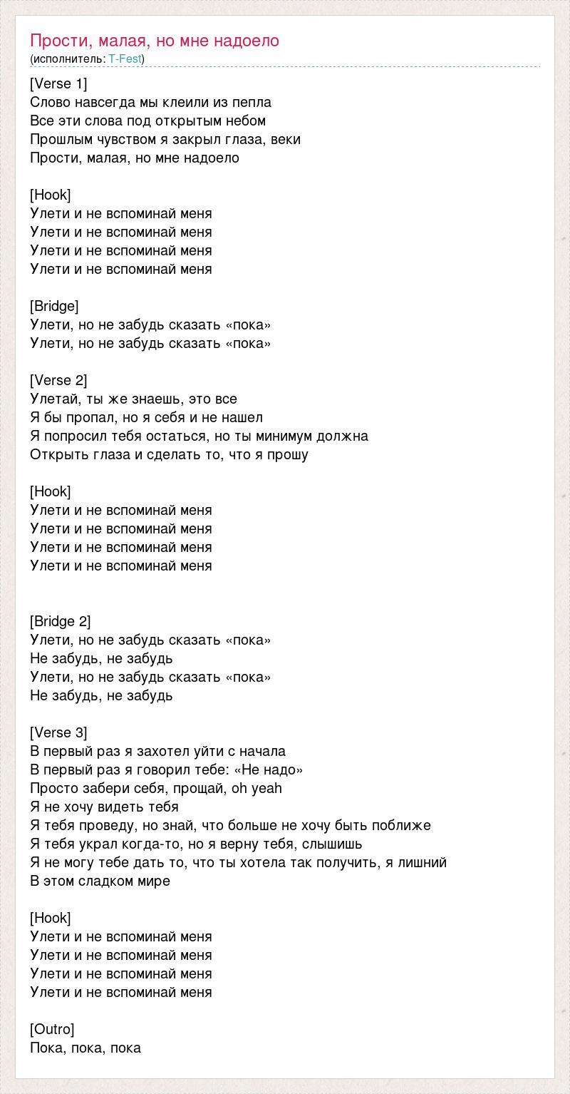 [Verse 1] Слово навсегда мы клеили из пепла Все эти слова под открытым небом Прошлым чувством я закрыл глаза, веки Прости, малая, но мне надоело [Hook] Улети и не вспоминай меня Улети и не вспоминай меня Улети и не вспоминай меня Улети и не вспоминай меня [Bridge] Улети, но не забудь сказать «пока» Улети, но не забудь сказать «пока» [Verse 2] Улетай, ты же знаешь, это все Я бы пропал, но я себя и не нашел Я попросил тебя остаться, но ты минимум должна Открыть глаза и сделать то, что я прошу [Hook] Улети и не вспоминай меня Улети и не вспоминай меня Улети и не вспоминай меня Улети и не вспоминай меня [Bridge 2] Улети, но не забудь сказать «пока» Не забудь, не забудь Улети, но не забудь сказать «пока» Не забудь, не забудь [Verse 3] В первый раз я захотел уйти с начала В первый раз я говорил тебе: «Не надо» Просто забери себя, прощай, oh yeah Я не хочу видеть тебя Я тебя проведу, но знай, что больше не хочу быть поближе Я тебя украл когда-то, но я верну тебя, слышишь Я не могу тебе дать то, что ты хотела так получить, я лишний В этом сладком мире [Hook] Улети и не вспоминай меня Улети и не вспоминай меня Улети и не вспоминай меня Улети и не вспоминай меня [Outro] Пока, пока, пока