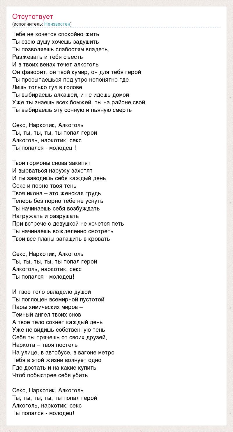 Тебе не хочется спокойно жить Ты свою душу хочешь задушить Ты позволяешь слабостям владеть, Разжевать и тебя съесть И в твоих венах течет алкоголь Он фаворит, он твой кумир, он для тебя герой Ты просыпаешься под утро непонятно где Лишь только гул в голове Ты выбираешь алкашей, и не идешь домой Уже ты знаешь всех бомжей, ты на районе свой Ты выбираешь эту сонную и пьяную смерть Секс, Наркотик, Алкоголь Ты, ты, ты, ты, ты попал герой Алкоголь, наркотик, секс Ты попался - молодец ! Твои гормоны снова закипят И вырваться наружу захотят И ты заводишь себя каждый день Секс и порно твоя тень Твоя икона – это женская грудь Теперь без порно тебе не уснуть Ты начинаешь себя возбуждать Нагружать и разрушать При встрече с девушкой не хочется петь Ты начинаешь вожделенно смотреть Твои все планы затащить в кровать Секс, Наркотик, Алкоголь Ты, ты, ты, ты, ты попал герой Алкоголь, наркотик, секс Ты попался - молодец! И твое тело овладело душой Ты поглощен всемирной пустотой Пары химических миров – Темный ангел твоих снов А твое тело сохнет каждый день Уже не видишь собственную тень Себя ты прячешь от своих друзей, Наркота – твоя постель На улице, в автобусе, в вагоне метро Тебя в этой жизни волнует одно Где достать и на какие купить Чтоб побыстрее себя убить Секс, Наркотик, Алкоголь Ты, ты, ты, ты, ты попал герой Алкоголь, наркотик, секс Ты попался - молодец!