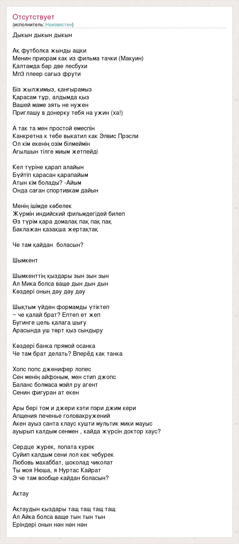 Дыкын дыкын дыкын Ақ футболка жынды ащки Менин приорам как из фильма тачки (Макуин) Қалтамда бар две лесбухи Мп3 плеер сағыз фрути Біз жылжимыз, қанғырамыз Қарасам тұр, алдымда қыз Вашей маме зять не нужен Приглашу в донерку тебя на ужин (ха!) А так та мен простой емеспін Канкретна к тебе выкатил как Элвис Прэсли Ол кім екенің озім білмеймін Ағылшын тілге миым жетпейді Кел түріне қарап алайын Бүйтіп қарасан қарапайым Атын кім болады? -Айым Онда саған спортивкам дайын Менің ішімде көбелек Жүрмін индийский фильмдегідей билеп Өз түрім қара домалақ пақ пақ пақ Баклажан қазақша жертақтақ Че там қайдан боласын? Шымкент Шымкенттің қыздары зын зын зын Ал Мика болса ваще дын дын дын Көздері оның дәу дәу дәу Шықтым үйден формамды үтіктеп ~ че қалай брат? Ептеп ет жеп Бугинге цель қалага шығу Арасында уш төрт қыз сындыру Көздері банка прямой осанка Че там брат делать? Вперёд как танка Хопс попс дженифер лопес Сен менің айфоным, мен стип джопс Баланс болмаса мэйл ру агент Сенин фигуран ат екен Ары бері том и джери кэти пэри джим кери Апщения печенье головакружений Акен ауыз санта клаус кушти мультик мики мауыс ауырып калдым сенмен , кайда жүрсін доктор xаус? Сердце журек, лопата курек Суйип калдым сени лол кек чебурек Любовь махаббат, шоколад чиколат Ты моя Нюша, я Нуртас Кайрат Э че там вообще кайдан боласын? Актау Ақтаудын қыздары тащ тащ тащ тащ Ал Айка болса ваще тын тын тын Еріндері онын нән нән нән