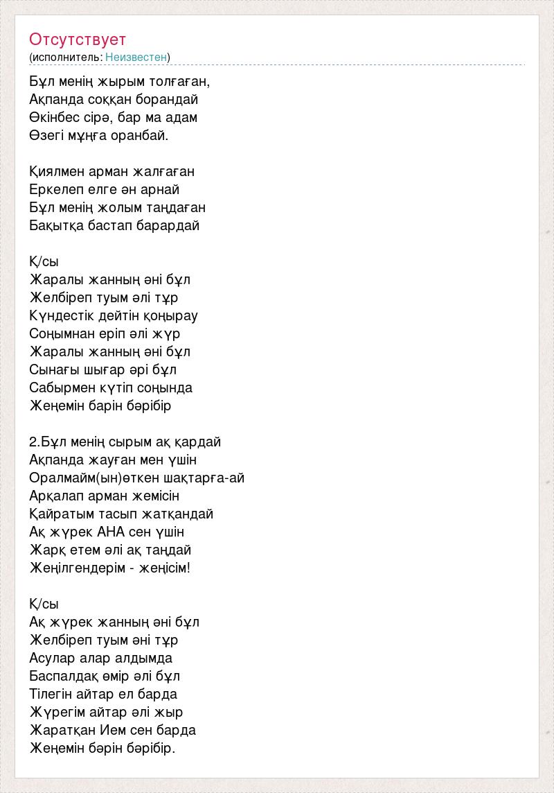 Бұл менің жырым толғаған, Ақпанда соққан борандай Өкінбес сірә, бар ма адам Өзегі мұңға оранбай. Қиялмен арман жалғаған Еркелеп елге ән арнай Бұл менің жолым таңдаған Бақытқа бастап барардай Қ/сы Жаралы жанның әні бұл Желбіреп туым әлі тұр Күндестік дейтін қоңырау Соңымнан еріп әлі жүр Жаралы жанның әні бұл Сынағы шығар әрі бұл Сабырмен күтіп соңында Жеңемін барін бәрібір 2.Бұл менің сырым ақ қардай Ақпанда жауған мен үшін Оралмайм(ын)өткен шақтарға-ай Арқалап арман жемісін Қайратым тасып жатқандай Ақ жүрек АНА сен үшін Жарқ етем әлі ақ таңдай Жеңілгендерім - жеңісім! Қ/сы Ақ жүрек жанның әні бұл Желбіреп туым әні тұр Асулар алар алдымда Баспалдақ өмір әлі бұл Тілегін айтар ел барда Жүрегім айтар әлі жыр Жаратқан Ием сен барда Жеңемін бәрін бәрібір.