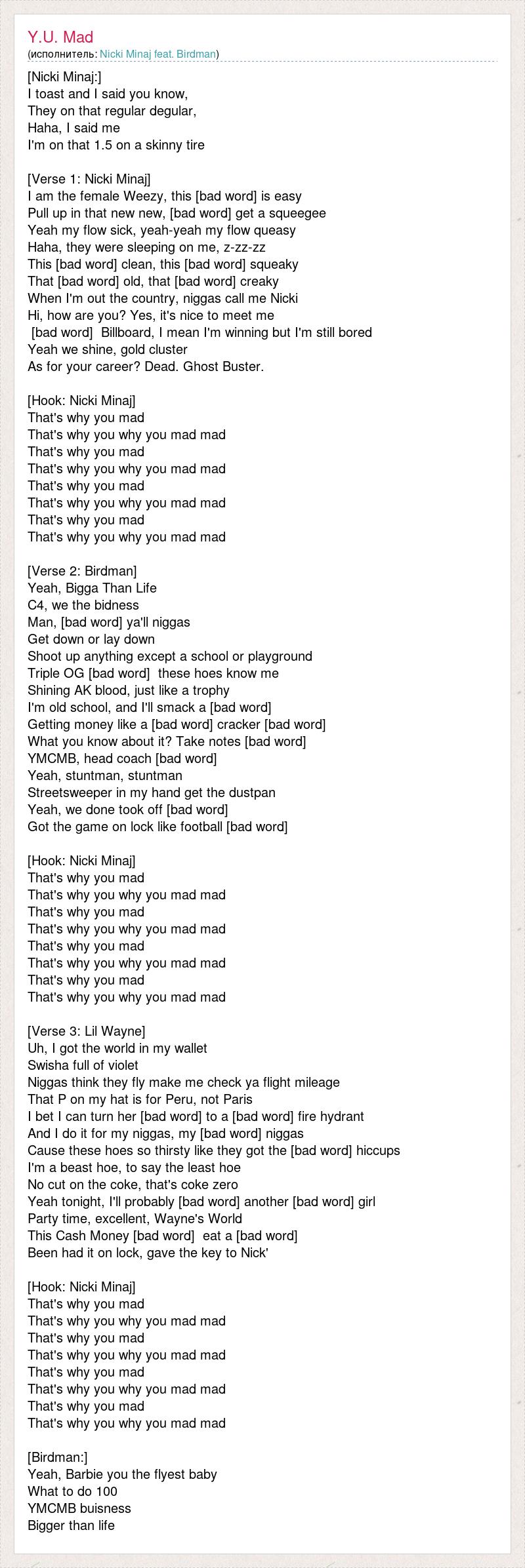 [Nicki Minaj:] I toast and I said you know, They on that regular degular, Haha, I said me I'm on that 1.5 on a skinny tire [Verse 1: Nicki Minaj] I am the female Weezy, this [bad word] is easy Pull up in that new new, [bad word] get a squeegee Yeah my flow sick, yeah-yeah my flow queasy Haha, they were sleeping on me, z-zz-zz This [bad word] clean, this [bad word] squeaky That [bad word] old, that [bad word] creaky When I'm out the country, niggas call me Nicki Hi, how are you? Yes, it's nice to meet me [bad word] Billboard, I mean I'm winning but I'm still bored Yeah we shine, gold cluster As for your career? Dead. Ghost Buster. [Hook: Nicki Minaj] That's why you mad That's why you why you mad mad That's why you mad That's why you why you mad mad That's why you mad That's why you why you mad mad That's why you mad That's why you why you mad mad [Verse 2: Birdman] Yeah, Bigga Than Life C4, we the bidness Man, [bad word] ya'll niggas Get down or lay down Shoot up anything except a school or playground Triple OG [bad word] these hoes know me Shining AK blood, just like a trophy I'm old school, and I'll smack a [bad word] Getting money like a [bad word] cracker [bad word] What you know about it? Take notes [bad word] YMCMB, head coach [bad word] Yeah, stuntman, stuntman Streetsweeper in my hand get the dustpan Yeah, we done took off [bad word] Got the game on lock like football [bad word] [Hook: Nicki Minaj] That's why you mad That's why you why you mad mad That's why you mad That's why you why you mad mad That's why you mad That's why you why you mad mad That's why you mad That's why you why you mad mad [Verse 3: Lil Wayne] Uh, I got the world in my wallet Swisha full of violet Niggas think they fly make me check ya flight mileage That P on my hat is for Peru, not Paris I bet I can turn her [bad word] to a [bad word] fire hydrant And I do it for my niggas, my [bad word] niggas Cause these hoes so thirsty like they got the [bad word] hiccups I'm a beast hoe, to say the least hoe No cut on the coke, that's coke zero Yeah tonight, I'll probably [bad word] another [bad word] girl Party time, excellent, Wayne's World This Cash Money [bad word] eat a [bad word] Been had it on lock, gave the key to Nick' [Hook: Nicki Minaj] That's why you mad That's why you why you mad mad That's why you mad That's why you why you mad mad That's why you mad That's why you why you mad mad That's why you mad That's why you why you mad mad [Birdman:] Yeah, Barbie you the flyest baby What to do 100 YMCMB buisness Bigger than life