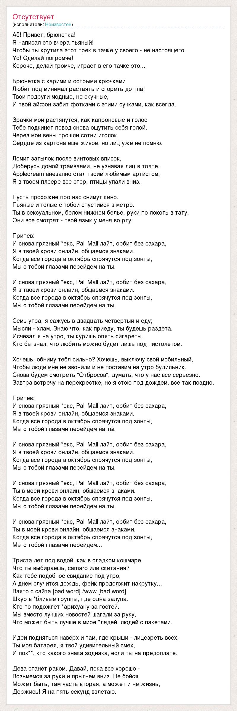 Аё! Привет, брюнетка! Я написал это вчера пьяный! Чтобы ты крутила этот трек в тачке у своего - не настоящего. Yo! Сделай погромче! Короче, делай громче, играет в его тачке это... Брюнетка с карими и острыми крючками Любит под минимал растаять и сгореть до тла! Твои подруги модные, но скучные, И твой айфон забит фотками с этими сучками, как всегда. Зрачки мои растянутся, как капроновые и голос Тебе подкинет повод снова ощутить себя голой. Через мои вены прошли сотни иголок, Сердце из картона еще живое, но лиц уже не помню. Ломит затылок после винтовых вписок, Доберусь домой трамваями, не узнавая лиц в толпе. Appledream внезапно стал твоим любимым артистом, Я в твоем плеере все стер, птицы упали вниз. Пусть прохожие про нас снимут кино. Пьяные и голые с тобой спустимся в метро. Ты в сексуальном, белом нижнем белье, руки по локоть в тату, Они все смотрят - твой язык у меня во рту. Припев: И снова грязный *екс, Pall Mall лайт, орбит без сахара, Я в твоей крови онлайн, общаемся знаками. Когда все города в октябрь спрячутся под зонты, Мы с тобой глазами перейдем на ты. И снова грязный *екс, Pall Mall лайт, орбит без сахара, Я в твоей крови онлайн, общаемся знаками. Когда все города в октябрь спрячутся под зонты, Мы с тобой глазами перейдем на ты. Семь утра, я сажусь в двадцать четвертый и еду; Мысли - хлам. Знаю что, как приеду, ты будешь раздета. Исчезал я на утро, ты куришь опять сигареты. Кто бы знал, что любить можно будет лишь под пистолетом. Хочешь, обниму тебя сильно? Хочешь, выключу свой мобильный, Чтобы люди мне не звонили и не поставим на утро будильник. Снова будем смотреть "Отбросов", думать, что у нас все серьезно. Завтра встречу на перекрестке, но я стою под дождем, все так поздно. Припев: И снова грязный *екс, Pall Mall лайт, орбит без сахара, Я в твоей крови онлайн, общаемся знаками. Когда все города в октябрь спрячутся под зонты, Мы с тобой глазами перейдем на ты. И снова грязный *екс, Pall Mall лайт, орбит без сахара, Я в твоей крови онлайн, общаемся знаками. Когда все города в октябрь спрячутся под зонты, Мы с тобой глазами перейдем на ты. И снова грязный *екс, Pall Mall лайт, орбит без сахара, Ты в моей крови онлайн, общаемся знаками. Когда все города в октябрь спрячутся под зонты, Мы с тобой глазами перейдем на ты. И снова грязный *екс, Pall Mall лайт, орбит без сахара, Ты в моей крови онлайн, общаемся знаками. Когда все города в октябрь спрячутся под зонты, Мы с тобой глазами перейдем... Триста лет под водой, как в сладком кошмаре. Что ты выбираешь, camaro или скитания? Как тебе подобное свидание под утро, А днем случится дождь, фейк продолжит накрутку... Взято с сайта [bad word] /www [bad word] Шкур в *бливые группы, где одна залупа. Кто-то подожгет *арихуану за гостей. Мы вместо лучших новостей шагали за руку, Что может быть лучше в мире *лядей, людей с пакетами. Идеи подняться наверх и там, где крыши - лицезреть всех, Ты моя батарея, я твой удивительный смех, И пох**, кто какого знака зодиака, если ты на предоплате. Дева станет раком. Давай, пока все хорошо - Возьмемся за руки и прыгнем вниз. Не бойся. Может быть, там часть вторая, а может и не жизнь, Держись! Я на пять секунд взлетаю.