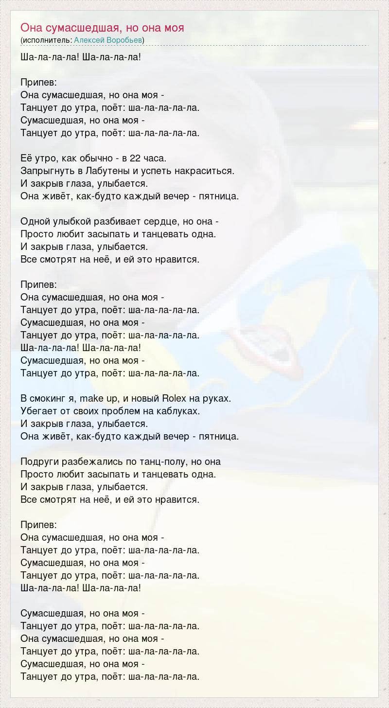 Ша-ла-ла-ла! Ша-ла-ла-ла! Припев: Она сумасшедшая, но она моя - Танцует до утра, поёт: ша-ла-ла-ла-ла. Сумасшедшая, но она моя - Танцует до утра, поёт: ша-ла-ла-ла-ла. Её утро, как обычно - в 22 часа. Запрыгнуть в Лабутены и успеть накраситься. И закрыв глаза, улыбается. Она живёт, как-будто каждый вечер - пятница. Одной улыбкой разбивает сердце, но она - Просто любит засыпать и танцевать одна. И закрыв глаза, улыбается. Все смотрят на неё, и ей это нравится. Припев: Она сумасшедшая, но она моя - Танцует до утра, поёт: ша-ла-ла-ла-ла. Сумасшедшая, но она моя - Танцует до утра, поёт: ша-ла-ла-ла-ла. Ша-ла-ла-ла! Ша-ла-ла-ла! Сумасшедшая, но она моя - Танцует до утра, поёт: ша-ла-ла-ла-ла. В смокинг я, make up, и новый Rolex на руках. Убегает от своих проблем на каблуках. И закрыв глаза, улыбается. Она живёт, как-будто каждый вечер - пятница. Подруги разбежались по танц-полу, но она Просто любит засыпать и танцевать одна. И закрыв глаза, улыбается. Все смотрят на неё, и ей это нравится. Припев: Она сумасшедшая, но она моя - Танцует до утра, поёт: ша-ла-ла-ла-ла. Сумасшедшая, но она моя - Танцует до утра, поёт: ша-ла-ла-ла-ла. Ша-ла-ла-ла! Ша-ла-ла-ла! Сумасшедшая, но она моя - Танцует до утра, поёт: ша-ла-ла-ла-ла. Она сумасшедшая, но она моя - Танцует до утра, поёт: ша-ла-ла-ла-ла. Сумасшедшая, но она моя - Танцует до утра, поёт: ша-ла-ла-ла-ла.