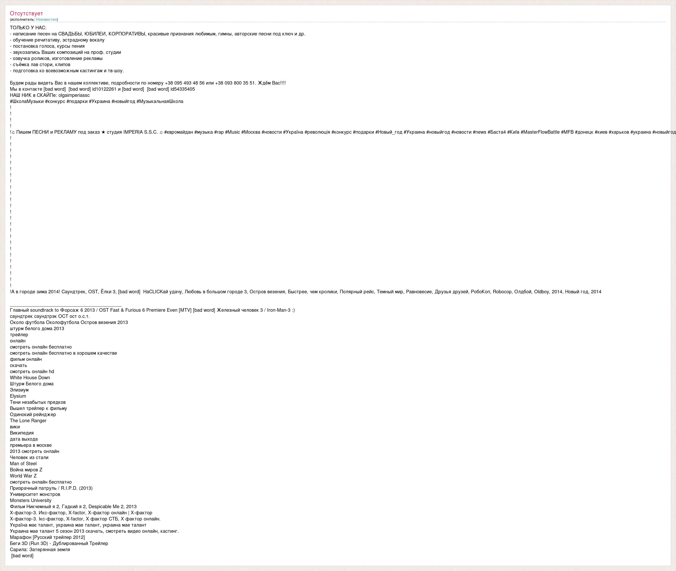 ТОЛЬКО У НАС: - написание песен на СВАДЬБЫ, ЮБИЛЕИ, КОРПОРАТИВЫ, красивые признания любимым, гимны, авторские песни под ключ и др. - обучение речитативу, эстрадному вокалу - постановка голоса, курсы пения - звукозапись Ваших композиций на проф. студии - озвучка роликов, изготовление рекламы - съёмка лав стори, клипов - подготовка ко всевозможным кастингам и тв-шоу. Будем рады видеть Вас в нашем коллективе, подробности по номеру +38 095 493 48 56 или +38 093 800 35 51. Ждём Вас!!!! Мы в контакте [bad word] [bad word] id10122261 и [bad word] [bad word] id54335405 НАШ НИК в СКАЙПе: olgaimperiassc #ШколаМузыки #конкурс #подарки #Украина #новыйгод #МузыкальнаяШкола ! ! ! ! !♫ Пишем ПЕСНИ и РЕКЛАМУ под заказ ★ студия IMPERIA S.S.C. ♫ #євромайдан #музыка #rap #Music #Москва #новости #Україна #революція #конкурс #подарки #Новый_год #Украина #новыйгод #новости #news #Баста4 #Київ #MasterFlowBattle #MFB #донецк #киев #харьков #украина #новыйгод ! ! ! ! ! ! ! ! ! ! ! ! ! ! ! ! ! ! ! ! ! ! ! ! ! !А в городе зима 2014! Саундтрек, OST, Ёлки 3, [bad word] НаCLICKай удачу, Любовь в большом городе 3, Остров везения, Быстрее, чем кролики, Полярный рейс, Темный мир, Равновесие, Друзья друзей, РобоКоп, Robocop, Олдбой, Oldboy, 2014, Новый год, 2014 ___________________________________________ Главный soundtrack to Форсаж 6 2013 / OST Fast & Furious 6 Premiere Even [MTV] [bad word] Железный человек 3 / Iron-Man-3 :) саундтрек саундтрэк ОСТ ост о.с.т. Около футбола Околофутбола Остров везения 2013 штурм белого дома 2013 трейлер онлайн смотреть онлайн бесплатно смотреть онлайн бесплатно в хорошем качестве фильм онлайн скачать смотреть онлайн hd White House Down Штурм Белого дома Элизиум Elysium Тени незабытых предков Вышел трейлер к фильму Одинокий рейнджер The Lone Ranger вики Википедия дата выхода премьера в москве 2013 смотреть онлайн Человек из стали Man of Steel Война миров Z World War Z смотреть онлайн бесплатно Призрачный патруль / R.I.P.D. (2013) Университет монстров Monsters University Фильм Никчемный я 2, Гадкий я 2, Despicable Me 2, 2013 Х-фактор-3. Икс-фактор, X-factor, Х-фактор онлайн | Х-фактор Х-фактор-3. Ікс-фактор, X-factor, Х фактор СТБ, Х фактор онлайн. Україна має талант, украина мае талант, украина мае талант Украина мае талант 5 сезон 2013 скачать, смотреть видео онлайн, кастинг. Марафон [Русский трейлер 2012] Беги 3D (Run 3D) - Дублированный Трейлер Сарила: Затерянная земля [bad word]