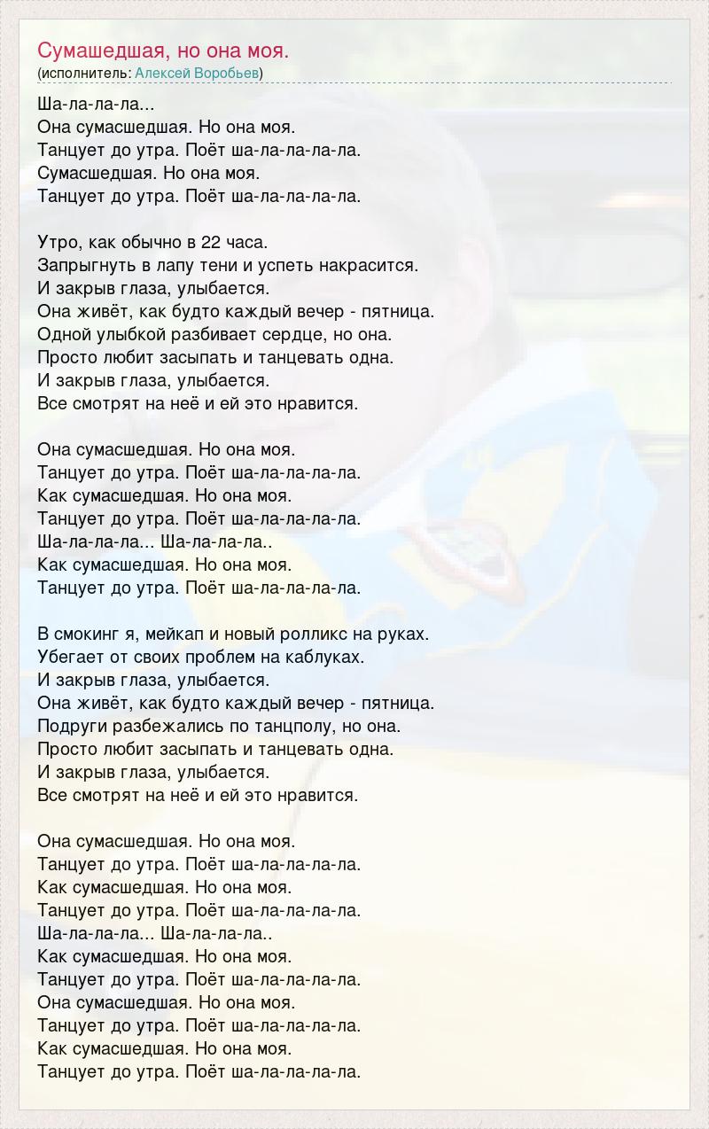 Ша-ла-ла-ла... Она сумасшедшая. Но она моя. Танцует до утра. Поёт ша-ла-ла-ла-ла. Сумасшедшая. Но она моя. Танцует до утра. Поёт ша-ла-ла-ла-ла. Утро, как обычно в 22 часа. Запрыгнуть в лапу тени и успеть накрасится. И закрыв глаза, улыбается. Она живёт, как будто каждый вечер - пятница. Одной улыбкой разбивает сердце, но она. Просто любит засыпать и танцевать одна. И закрыв глаза, улыбается. Все смотрят на неё и ей это нравится. Она сумасшедшая. Но она моя. Танцует до утра. Поёт ша-ла-ла-ла-ла. Как сумасшедшая. Но она моя. Танцует до утра. Поёт ша-ла-ла-ла-ла. Ша-ла-ла-ла... Ша-ла-ла-ла.. Как сумасшедшая. Но она моя. Танцует до утра. Поёт ша-ла-ла-ла-ла. В смокинг я, мейкап и новый ролликс на руках. Убегает от своих проблем на каблуках. И закрыв глаза, улыбается. Она живёт, как будто каждый вечер - пятница. Подруги разбежались по танцполу, но она. Просто любит засыпать и танцевать одна. И закрыв глаза, улыбается. Все смотрят на неё и ей это нравится. Она сумасшедшая. Но она моя. Танцует до утра. Поёт ша-ла-ла-ла-ла. Как сумасшедшая. Но она моя. Танцует до утра. Поёт ша-ла-ла-ла-ла. Ша-ла-ла-ла... Ша-ла-ла-ла.. Как сумасшедшая. Но она моя. Танцует до утра. Поёт ша-ла-ла-ла-ла. Она сумасшедшая. Но она моя. Танцует до утра. Поёт ша-ла-ла-ла-ла. Как сумасшедшая. Но она моя. Танцует до утра. Поёт ша-ла-ла-ла-ла.