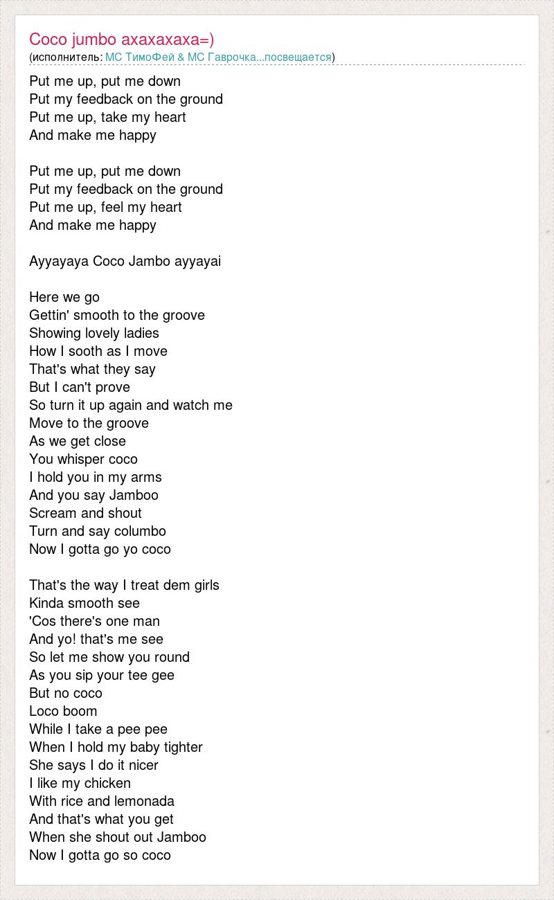Put me up, put me down Put my feedback on the ground Put me up, take my heart And make me happy Put me up, put me down Put my feedback on the ground Put me up, feel my heart And make me happy Ayyayaya Coco Jambo ayyayai Here we go Gettin' smooth to the groove Showing lovely ladies How I sooth as I move That's what they say But I can't prove So turn it up again and watch me Move to the groove As we get close You whisper coco I hold you in my arms And you say Jamboo Scream and shout Turn and say columbo Now I gotta go yo coco That's the way I treat dem girls Kinda smooth see 'Cos there's one man And yo! that's me see So let me show you round As you sip your tee gee But no coco Loco boom While I take a pee pee When I hold my baby tighter She says I do it nicer I like my chicken With rice and lemonada And that's what you get When she shout out Jamboo Now I gotta go so coco