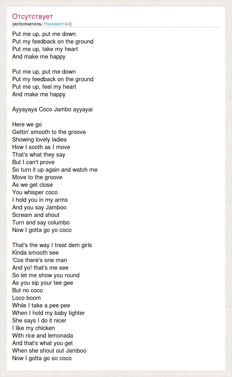 Put me up, put me down Put my feedback on the ground Put me up, take my heart And make me happy Put me up, put me down Put my feedback on the ground Put me up, feel my heart And make me happy Ayyayaya Coco Jambo ayyayai Here we go Gettin' smooth to the groove Showing lovely ladies How I sooth as I move That's what they say But I can't prove So turn it up again and watch me Move to the groove As we get close You whisper coco I hold you in my arms And you say Jamboo Scream and shout Turn and say columbo Now I gotta go yo coco That's the way I treat dem girls Kinda smooth see 'Cos there's one man And yo! that's me see So let me show you round As you sip your tee gee But no coco Loco boom While I take a pee pee When I hold my baby tighter She says I do it nicer I like my chicken With rice and lemonada And that's what you get When she shout out Jamboo Now I gotta go so coco