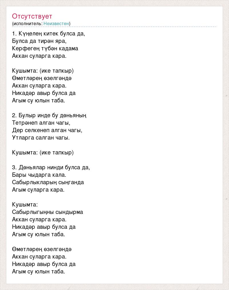 1. Күңелең китек булса да, Булса да тирән яра, Керфегең түбән кадама Аккан суларга кара. Кушымта: (ике тапкыр) Өметләрең өзелгәндә Аккан суларга кара. Никадәр авыр булса да Агым су юлын таба. 2. Булыр инде бу дөньяның Тетрәнеп алган чагы, Дер селкенеп алган чагы, Утларга салган чагы. Кушымта: (ике тапкыр) 3. Дөньялар нинди булса да, Бары чыдарга кала. Сабырлыкларың сыңганда Агым суларга кара. Кушымта: Сабырлыгыңны сындырма Аккан суларга кара. Никадәр авыр булса да Агым су юлын таба. Өметләрең өзелгәндә Аккан суларга кара. Никадәр авыр булса да Агым су юлын таба.