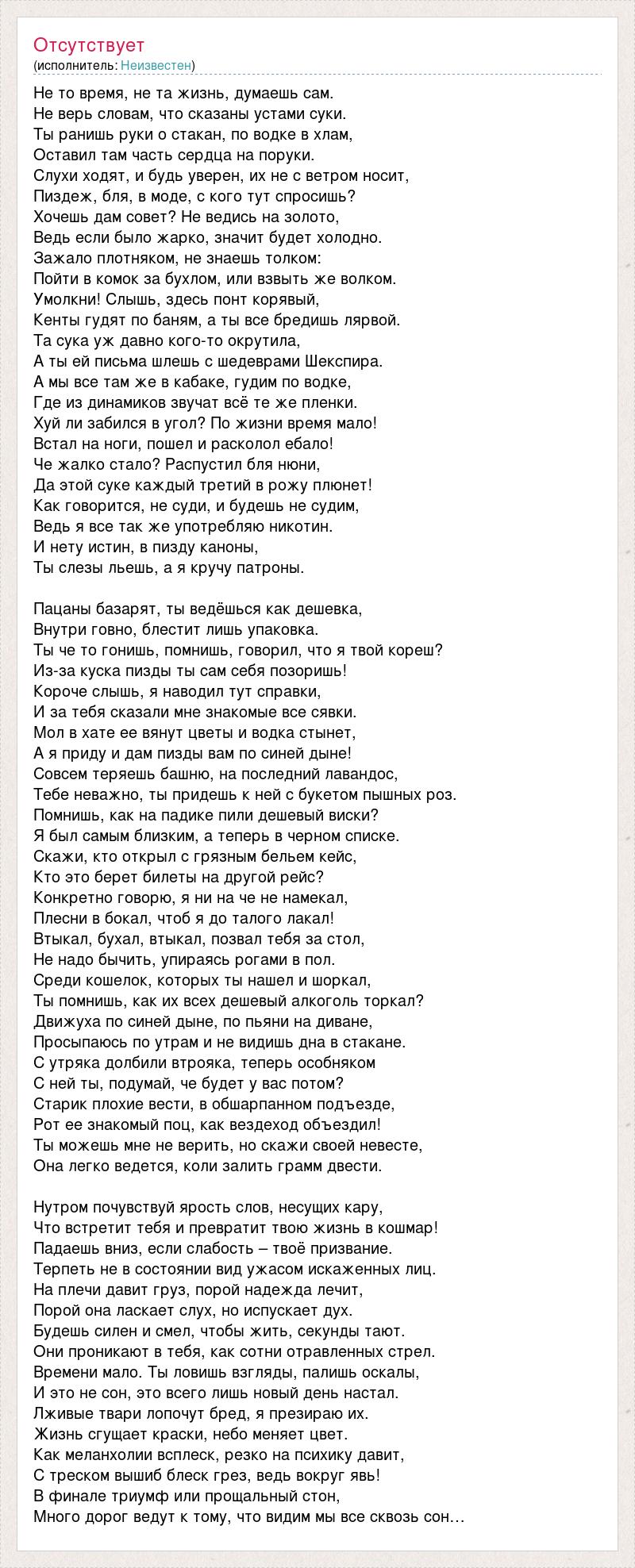 Не то время, не та жизнь, думаешь сам. Не верь словам, что сказаны устами суки. Ты ранишь руки о стакан, по водке в хлам, Оставил там часть сердца на поруки. Слухи ходят, и будь уверен, их не с ветром носит, Пиздеж, бля, в моде, с кого тут спросишь? Хочешь дам совет? Не ведись на золото, Ведь если было жарко, значит будет холодно. Зажало плотняком, не знаешь толком: Пойти в комок за бухлом, или взвыть же волком. Умолкни! Слышь, здесь понт корявый, Кенты гудят по баням, а ты все бредишь лярвой. Та сука уж давно кого-то окрутила, А ты ей письма шлешь с шедеврами Шекспира. А мы все там же в кабаке, гудим по водке, Где из динамиков звучат всё те же пленки. Хуй ли забился в угол? По жизни время мало! Встал на ноги, пошел и расколол ебало! Че жалко стало? Распустил бля нюни, Да этой суке каждый третий в рожу плюнет! Как говорится, не суди, и будешь не судим, Ведь я все так же употребляю никотин. И нету истин, в пизду каноны, Ты слезы льешь, а я кручу патроны. Пацаны базарят, ты ведёшься как дешевка, Внутри говно, блестит лишь упаковка. Ты че то гонишь, помнишь, говорил, что я твой кореш? Из-за куска пизды ты сам себя позоришь! Короче слышь, я наводил тут справки, И за тебя сказали мне знакомые все сявки. Мол в хате ее вянут цветы и водка стынет, А я приду и дам пизды вам по синей дыне! Совсем теряешь башню, на последний лавандос, Тебе неважно, ты придешь к ней с букетом пышных роз. Помнишь, как на падике пили дешевый виски? Я был самым близким, а теперь в черном списке. Скажи, кто открыл с грязным бельем кейс, Кто это берет билеты на другой рейс? Конкретно говорю, я ни на че не намекал, Плесни в бокал, чтоб я до талого лакал! Втыкал, бухал, втыкал, позвал тебя за стол, Не надо бычить, упираясь рогами в пол. Среди кошелок, которых ты нашел и шоркал, Ты помнишь, как их всех дешевый алкоголь торкал? Движуха по синей дыне, по пьяни на диване, Просыпаюсь по утрам и не видишь дна в стакане. С утряка долбили втрояка, теперь особняком С ней ты, подумай, че будет у вас потом? Старик плохие вести, в обшарпанном подъезде, Рот ее знакомый поц, как вездеход объездил! Ты можешь мне не верить, но скажи своей невесте, Она легко ведется, коли залить грамм двести. Нутром почувствуй ярость слов, несущих кару, Что встретит тебя и превратит твою жизнь в кошмар! Падаешь вниз, если слабость – твоё призвание. Терпеть не в состоянии вид ужасом искаженных лиц. На плечи давит груз, порой надежда лечит, Порой она ласкает слух, но испускает дух. Будешь силен и смел, чтобы жить, секунды тают. Они проникают в тебя, как сотни отравленных стрел. Времени мало. Ты ловишь взгляды, палишь оскалы, И это не сон, это всего лишь новый день настал. Лживые твари лопочут бред, я презираю их. Жизнь сгущает краски, небо меняет цвет. Как меланхолии всплеск, резко на психику давит, С треском вышиб блеск грез, ведь вокруг явь! В финале триумф или прощальный стон, Много дорог ведут к тому, что видим мы все сквозь сон…