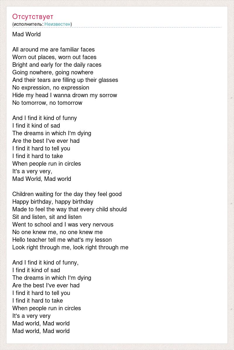 Mad World All around me are familiar faces Worn out places, worn out faces Bright and early for the daily races Going nowhere, going nowhere And their tears are filling up their glasses No expression, no expression Hide my head I wanna drown my sorrow No tomorrow, no tomorrow And I find it kind of funny I find it kind of sad The dreams in which I'm dying Are the best I've ever had I find it hard to tell you I find it hard to take When people run in circles It's a very very, Mad World, Mad world Children waiting for the day they feel good Happy birthday, happy birthday Made to feel the way that every child should Sit and listen, sit and listen Went to school and I was very nervous No one knew me, no one knew me Hello teacher tell me what's my lesson Look right through me, look right through me And I find it kind of funny, I find it kind of sad The dreams in which I'm dying Are the best I've ever had I find it hard to tell you I find it hard to take When people run in circles It's a very very Mad world, Mad world Mad world, Mad world