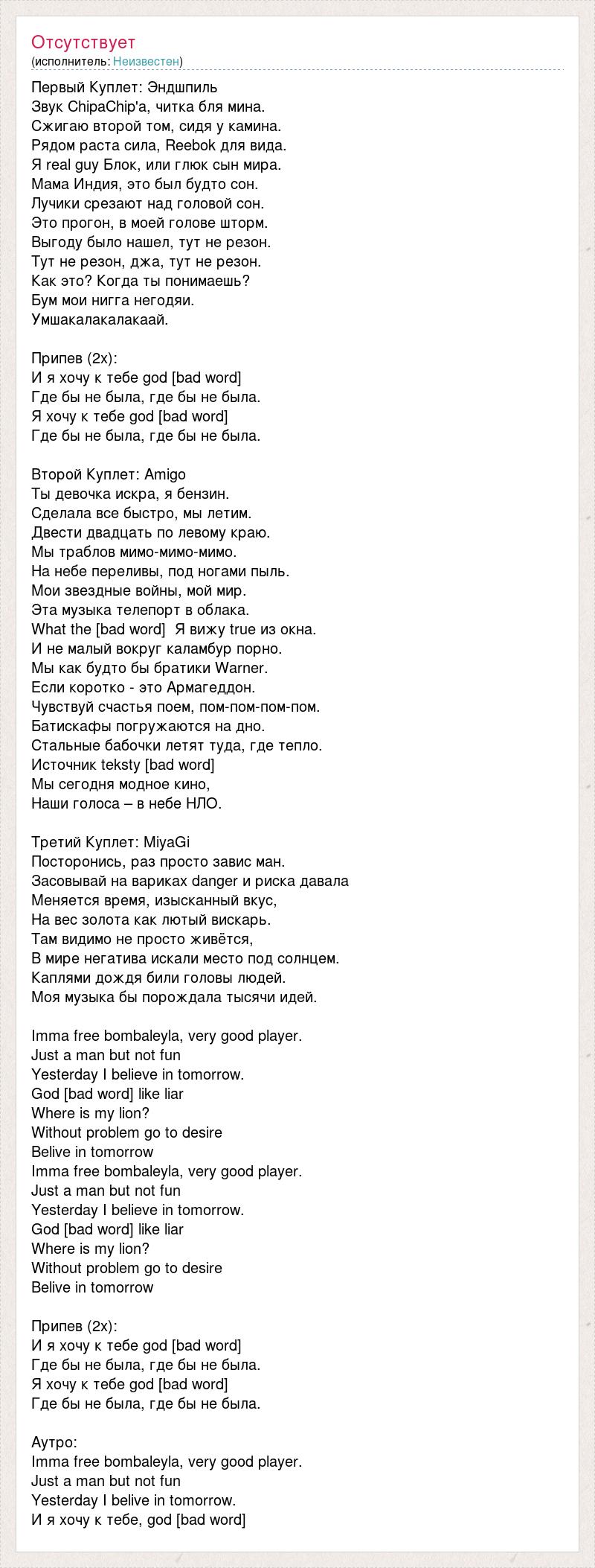 Первый Куплет: Эндшпиль Звук ChipaChip'а, читка бля мина. Сжигаю второй том, сидя у камина. Рядом раста сила, Reebok для вида. Я real guy Блок, или глюк сын мира. Мама Индия, это был будто сон. Лучики срезают над головой сон. Это прогон, в моей голове шторм. Выгоду было нашел, тут не резон. Тут не резон, джа, тут не резон. Как это? Когда ты понимаешь? Бум мои нигга негодяи. Умшакалакалакаай. Припев (2x): И я хочу к тебе god [bad word] Где бы не была, где бы не была. Я хочу к тебе god [bad word] Где бы не была, где бы не была. Второй Куплет: Amigo Ты девочка искра, я бензин. Сделала все быстро, мы летим. Двести двадцать по левому краю. Мы траблов мимо-мимо-мимо. На небе переливы, под ногами пыль. Мои звездные войны, мой мир. Эта музыка телепорт в облака. What the [bad word] Я вижу true из окна. И не малый вокруг каламбур порно. Мы как будто бы братики Warner. Если коротко - это Армагеддон. Чувствуй счастья поем, пом-пом-пом-пом. Батискафы погружаются на дно. Стальные бабочки летят туда, где тепло. Источник teksty [bad word] Мы сегодня модное кино, Наши голоса – в небе НЛО. Третий Куплет: MiyaGi Посторонись, раз просто завис ман. Засовывай на вариках danger и риска давала Меняется время, изысканный вкус, На вес золота как лютый вискарь. Там видимо не просто живётся, В мире негатива искали место под солнцем. Каплями дождя били головы людей. Моя музыка бы порождала тысячи идей. Imma free bombaleyla, very good player. Just a man but not fun Yesterday I believe in tomorrow. God [bad word] like liar Where is my lion? Without problem go to desire Belive in tomorrow Imma free bombaleyla, very good player. Just a man but not fun Yesterday I believe in tomorrow. God [bad word] like liar Where is my lion? Without problem go to desire Belive in tomorrow Припев (2x): И я хочу к тебе god [bad word] Где бы не была, где бы не была. Я хочу к тебе god [bad word] Где бы не была, где бы не была. Аутро: Imma free bombaleyla, very good player. Just a man but not fun Yesterday I belive in tomorrow. И я хочу к тебе, god [bad word]
