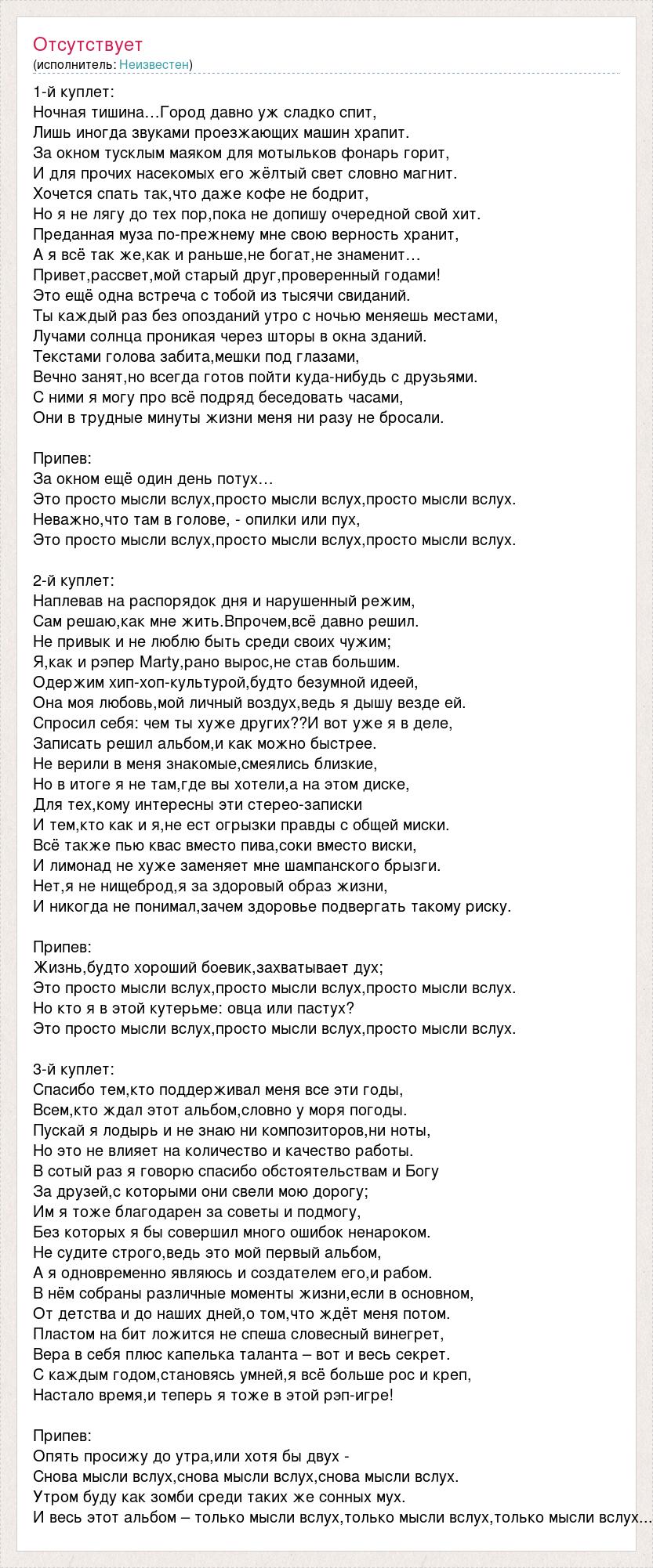 1-й куплет: Ночная тишина…Город давно уж сладко спит, Лишь иногда звуками проезжающих машин храпит. За окном тусклым маяком для мотыльков фонарь горит, И для прочих насекомых его жёлтый свет словно магнит. Хочется спать так,что даже кофе не бодрит, Но я не лягу до тех пор,пока не допишу очередной свой хит. Преданная муза по-прежнему мне свою верность хранит, А я всё так же,как и раньше,не богат,не знаменит… Привет,рассвет,мой старый друг,проверенный годами! Это ещё одна встреча с тобой из тысячи свиданий. Ты каждый раз без опозданий утро с ночью меняешь местами, Лучами солнца проникая через шторы в окна зданий. Текстами голова забита,мешки под глазами, Вечно занят,но всегда готов пойти куда-нибудь с друзьями. С ними я могу про всё подряд беседовать часами, Они в трудные минуты жизни меня ни разу не бросали. Припев: За окном ещё один день потух… Это просто мысли вслух,просто мысли вслух,просто мысли вслух. Неважно,что там в голове, - опилки или пух, Это просто мысли вслух,просто мысли вслух,просто мысли вслух. 2-й куплет: Наплевав на распорядок дня и нарушенный режим, Сам решаю,как мне жить.Впрочем,всё давно решил. Не привык и не люблю быть среди своих чужим; Я,как и рэпер Marty,рано вырос,не став большим. Одержим хип-хоп-культурой,будто безумной идеей, Она моя любовь,мой личный воздух,ведь я дышу везде ей. Спросил себя: чем ты хуже других??И вот уже я в деле, Записать решил альбом,и как можно быстрее. Не верили в меня знакомые,смеялись близкие, Но в итоге я не там,где вы хотели,а на этом диске, Для тех,кому интересны эти стерео-записки И тем,кто как и я,не ест огрызки правды с общей миски. Всё также пью квас вместо пива,соки вместо виски, И лимонад не хуже заменяет мне шампанского брызги. Нет,я не нищеброд,я за здоровый образ жизни, И никогда не понимал,зачем здоровье подвергать такому риску. Припев: Жизнь,будто хороший боевик,захватывает дух; Это просто мысли вслух,просто мысли вслух,просто мысли вслух. Но кто я в этой кутерьме: овца или пастух? Это просто мысли вслух,просто мысли вслух,просто мысли вслух. 3-й куплет: Спасибо тем,кто поддерживал меня все эти годы, Всем,кто ждал этот альбом,словно у моря погоды. Пускай я лодырь и не знаю ни композиторов,ни ноты, Но это не влияет на количество и качество работы. В сотый раз я говорю спасибо обстоятельствам и Богу За друзей,с которыми они свели мою дорогу; Им я тоже благодарен за советы и подмогу, Без которых я бы совершил много ошибок ненароком. Не судите строго,ведь это мой первый альбом, А я одновременно являюсь и создателем его,и рабом. В нём собраны различные моменты жизни,если в основном, От детства и до наших дней,о том,что ждёт меня потом. Пластом на бит ложится не спеша словесный винегрет, Вера в себя плюс капелька таланта – вот и весь секрет. С каждым годом,становясь умней,я всё больше рос и креп, Настало время,и теперь я тоже в этой рэп-игре! Припев: Опять просижу до утра,или хотя бы двух - Снова мысли вслух,снова мысли вслух,снова мысли вслух. Утром буду как зомби среди таких же сонных мух. И весь этот альбом – только мысли вслух,только мысли вслух,только мысли вслух...