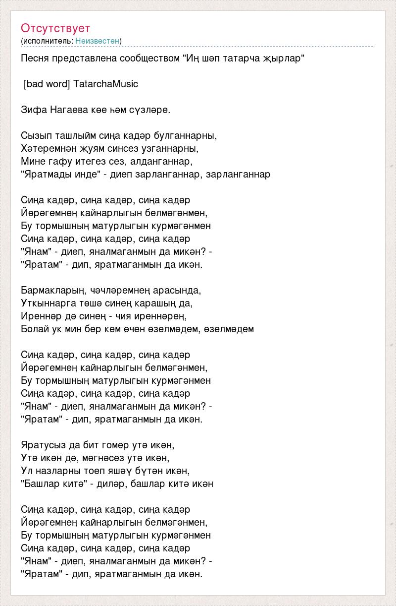 Песня представлена сообществом "Иң шәп татарча җырлар" [bad word] TatarchaMusic Зифа Нагаева көе һәм сүзләре. Сызып ташлыйм сиңа кадәр булганнарны, Хәтеремнән җуям синсез узганнарны, Мине гафу итегез сез, алданганнар, "Яратмады инде" - диеп зарланганнар, зарланганнар Сиңа кадәр, сиңа кадәр, сиңа кадәр Йөрәгемнең кайнарлыгын белмәгәнмен, Бу тормышның матурлыгын курмәгәнмен Сиңа кадәр, сиңа кадәр, сиңа кадәр "Янам" - диеп, яналмаганмын да микән? - "Яратам" - дип, яратмаганмын да икән. Бармакларың, чәчләремнең арасында, Уткыннарга төшә синең карашың да, Иреннәр дә синең - чия иреннәрең, Болай ук мин бер кем өчен өзелмәдем, өзелмәдем Сиңа кадәр, сиңа кадәр, сиңа кадәр Йөрәгемнең кайнарлыгын белмәгәнмен, Бу тормышның матурлыгын курмәгәнмен Сиңа кадәр, сиңа кадәр, сиңа кадәр "Янам" - диеп, яналмаганмын да микән? - "Яратам" - дип, яратмаганмын да икән. Яратусыз да бит гомер утә икән, Утә икән дә, мәгнәсез утә икән, Ул назларны тоеп яшәү бүтән икән, "Башлар китә" - диләр, башлар китә икән Сиңа кадәр, сиңа кадәр, сиңа кадәр Йөрәгемнең кайнарлыгын белмәгәнмен, Бу тормышның матурлыгын курмәгәнмен Сиңа кадәр, сиңа кадәр, сиңа кадәр "Янам" - диеп, яналмаганмын да микән? - "Яратам" - дип, яратмаганмын да икән.