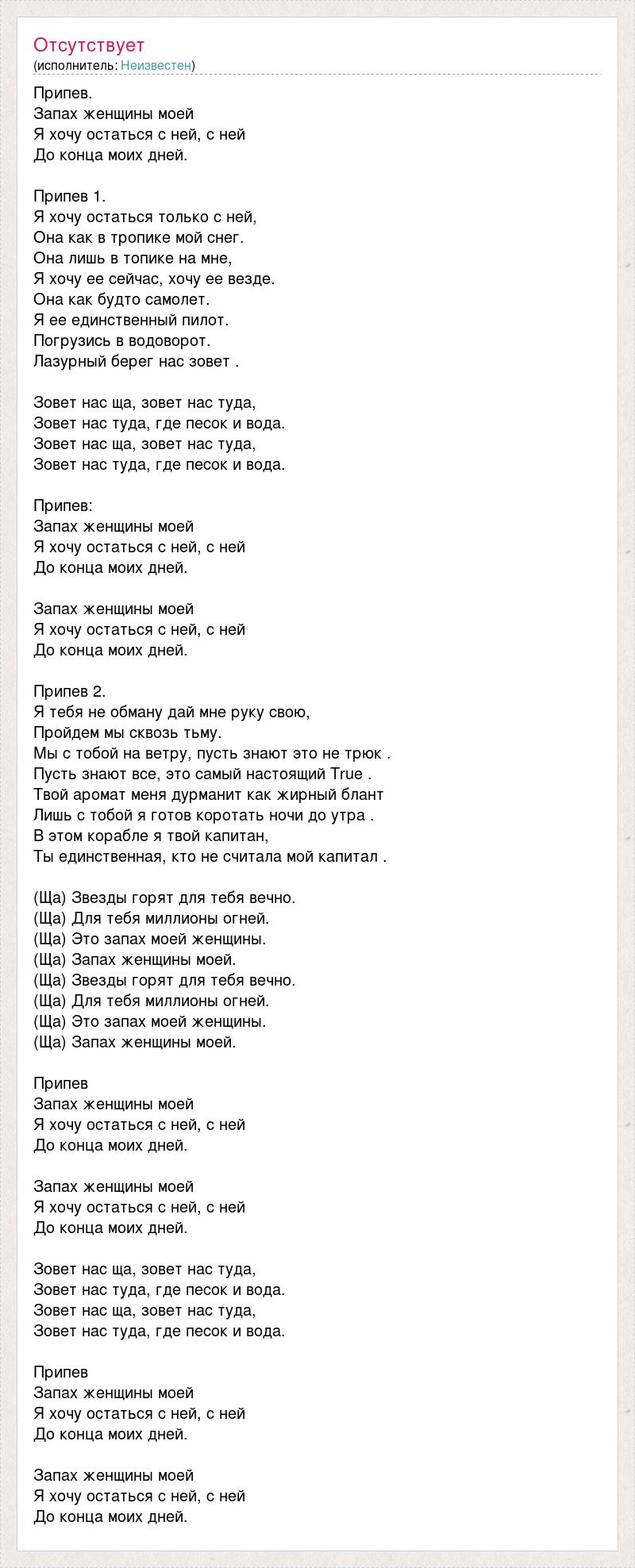 Припев. Запах женщины моей Я хочу остаться с ней, с ней До конца моих дней. Припев 1. Я хочу остаться только с ней, Она как в тропике мой снег. Она лишь в топике на мне, Я хочу ее сейчас, хочу ее везде. Она как будто самолет. Я ее единственный пилот. Погрузись в водоворот. Лазурный берег нас зовет . Зовет нас ща, зовет нас туда, Зовет нас туда, где песок и вода. Зовет нас ща, зовет нас туда, Зовет нас туда, где песок и вода. Припев: Запах женщины моей Я хочу остаться с ней, с ней До конца моих дней. Запах женщины моей Я хочу остаться с ней, с ней До конца моих дней. Припев 2. Я тебя не обману дай мне руку свою, Пройдем мы сквозь тьму. Мы с тобой на ветру, пусть знают это не трюк . Пусть знают все, это самый настоящий True . Твой аромат меня дурманит как жирный блант Лишь с тобой я готов коротать ночи до утра . В этом корабле я твой капитан, Ты единственная, кто не считала мой капитал . (Ща) Звезды горят для тебя вечно. (Ща) Для тебя миллионы огней. (Ща) Это запах моей женщины. (Ща) Запах женщины моей. (Ща) Звезды горят для тебя вечно. (Ща) Для тебя миллионы огней. (Ща) Это запах моей женщины. (Ща) Запах женщины моей. Припев Запах женщины моей Я хочу остаться с ней, с ней До конца моих дней. Запах женщины моей Я хочу остаться с ней, с ней До конца моих дней. Зовет нас ща, зовет нас туда, Зовет нас туда, где песок и вода. Зовет нас ща, зовет нас туда, Зовет нас туда, где песок и вода. Припев Запах женщины моей Я хочу остаться с ней, с ней До конца моих дней. Запах женщины моей Я хочу остаться с ней, с ней До конца моих дней.