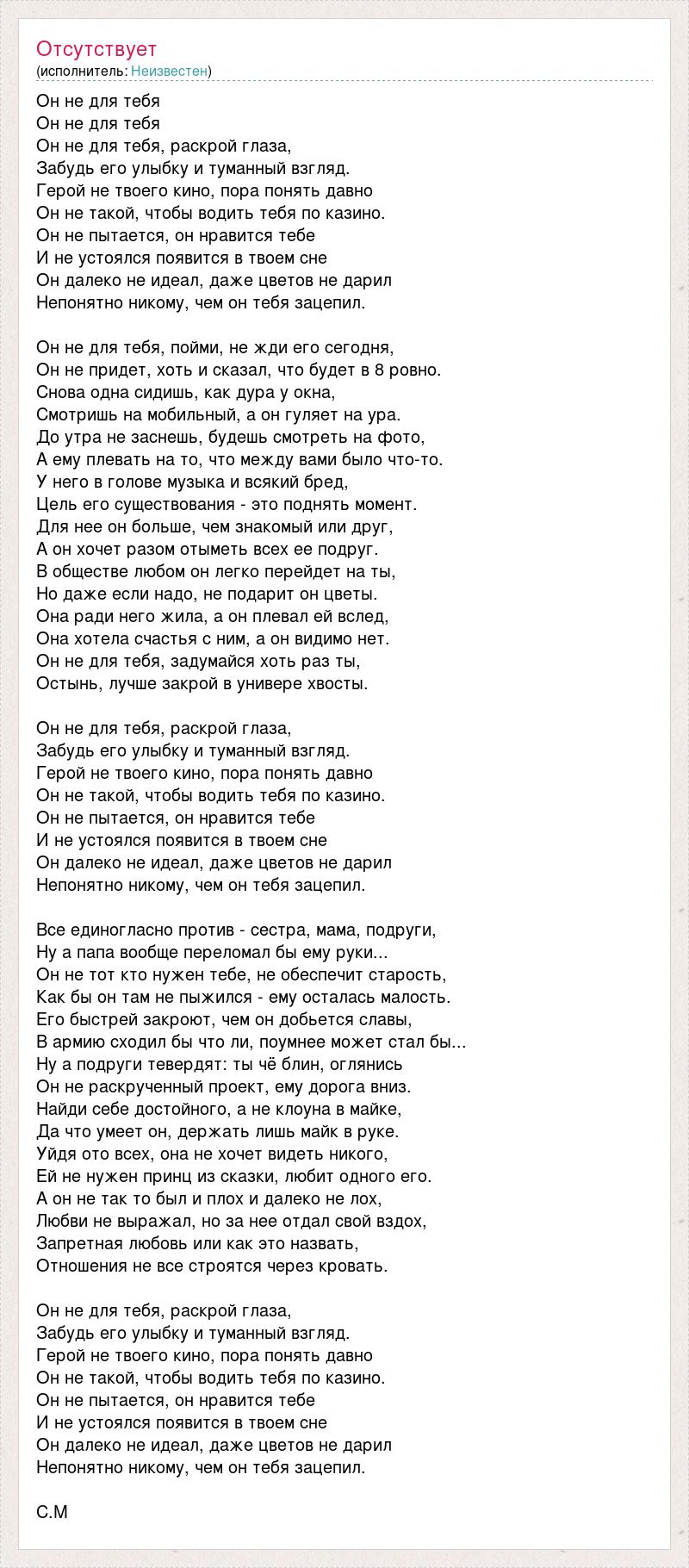 Он не для тебя Он не для тебя Он не для тебя, раскрой глаза, Забудь его улыбку и туманный взгляд. Герой не твоего кино, пора понять давно Он не такой, чтобы водить тебя по казино. Он не пытается, он нравится тебе И не устоялся появится в твоем сне Он далеко не идеал, даже цветов не дарил Непонятно никому, чем он тебя зацепил. Он не для тебя, пойми, не жди его сегодня, Он не придет, хоть и сказал, что будет в 8 ровно. Снова одна сидишь, как дура у окна, Смотришь на мобильный, а он гуляет на ура. До утра не заснешь, будешь смотреть на фото, А ему плевать на то, что между вами было что-то. У него в голове музыка и всякий бред, Цель его существования - это поднять момент. Для нее он больше, чем знакомый или друг, А он хочет разом отыметь всех ее подруг. В обществе любом он легко перейдет на ты, Но даже если надо, не подарит он цветы. Она ради него жила, а он плевал ей вслед, Она хотела счастья с ним, а он видимо нет. Он не для тебя, задумайся хоть раз ты, Остынь, лучше закрой в универе хвосты. Он не для тебя, раскрой глаза, Забудь его улыбку и туманный взгляд. Герой не твоего кино, пора понять давно Он не такой, чтобы водить тебя по казино. Он не пытается, он нравится тебе И не устоялся появится в твоем сне Он далеко не идеал, даже цветов не дарил Непонятно никому, чем он тебя зацепил. Все единогласно против - сестра, мама, подруги, Ну а папа вообще переломал бы ему руки... Он не тот кто нужен тебе, не обеспечит старость, Как бы он там не пыжился - ему осталась малость. Его быстрей закроют, чем он добьется славы, В армию сходил бы что ли, поумнее может стал бы... Ну а подруги тевердят: ты чё блин, оглянись Он не раскрученный проект, ему дорога вниз. Найди себе достойного, а не клоуна в майке, Да что умеет он, держать лишь майк в руке. Уйдя ото всех, она не хочет видеть никого, Ей не нужен принц из сказки, любит одного его. А он не так то был и плох и далеко не лох, Любви не выражал, но за нее отдал свой вздох, Запретная любовь или как это назвать, Отношения не все строятся через кровать. Он не для тебя, раскрой глаза, Забудь его улыбку и туманный взгляд. Герой не твоего кино, пора понять давно Он не такой, чтобы водить тебя по казино. Он не пытается, он нравится тебе И не устоялся появится в твоем сне Он далеко не идеал, даже цветов не дарил Непонятно никому, чем он тебя зацепил. С.М