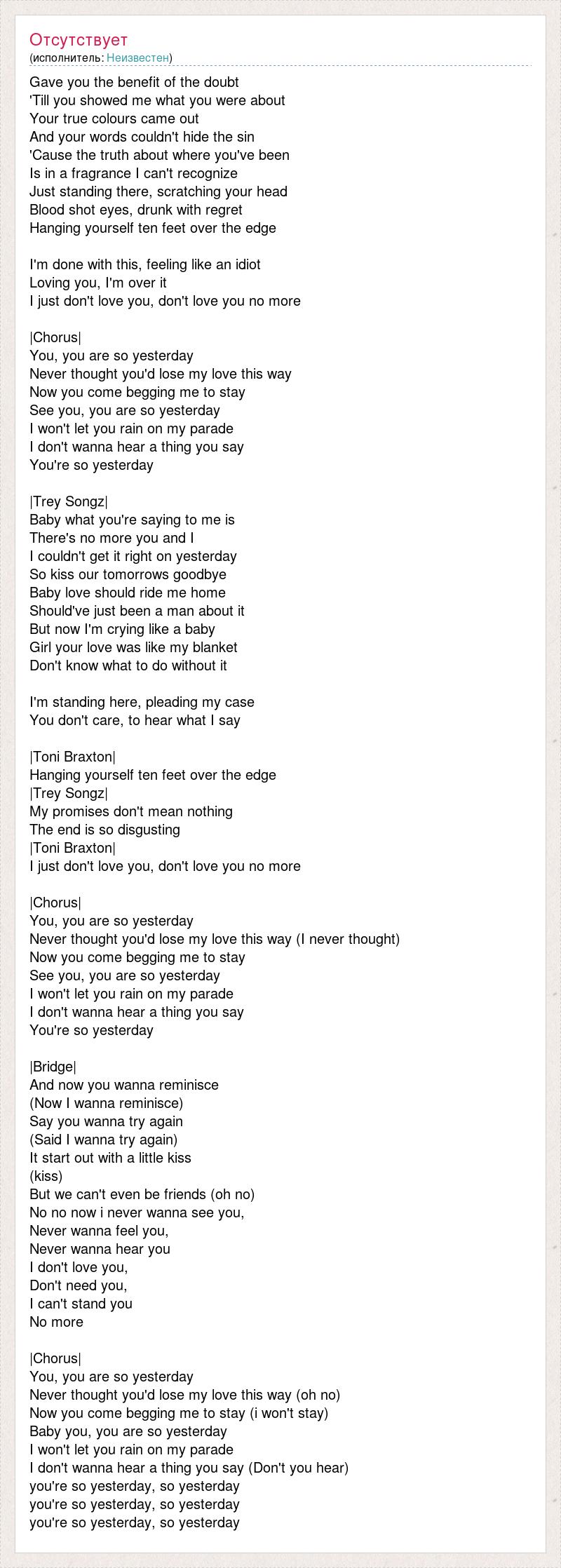 Gave you the benefit of the doubt 'Till you showed me what you were about Your true colours came out And your words couldn't hide the sin 'Cause the truth about where you've been Is in a fragrance I can't recognize Just standing there, scratching your head Blood shot eyes, drunk with regret Hanging yourself ten feet over the edge I'm done with this, feeling like an idiot Loving you, I'm over it I just don't love you, don't love you no more |Chorus| You, you are so yesterday Never thought you'd lose my love this way Now you come begging me to stay See you, you are so yesterday I won't let you rain on my parade I don't wanna hear a thing you say You're so yesterday |Trey Songz| Baby what you're saying to me is There's no more you and I I couldn't get it right on yesterday So kiss our tomorrows goodbye Baby love should ride me home Should've just been a man about it But now I'm crying like a baby Girl your love was like my blanket Don't know what to do without it I'm standing here, pleading my case You don't care, to hear what I say |Toni Braxton| Hanging yourself ten feet over the edge |Trey Songz| My promises don't mean nothing The end is so disgusting |Toni Braxton| I just don't love you, don't love you no more |Chorus| You, you are so yesterday Never thought you'd lose my love this way (I never thought) Now you come begging me to stay See you, you are so yesterday I won't let you rain on my parade I don't wanna hear a thing you say You're so yesterday |Bridge| And now you wanna reminisce (Now I wanna reminisce) Say you wanna try again (Said I wanna try again) It start out with a little kiss (kiss) But we can't even be friends (oh no) No no now i never wanna see you, Never wanna feel you, Never wanna hear you I don't love you, Don't need you, I can't stand you No more |Chorus| You, you are so yesterday Never thought you'd lose my love this way (oh no) Now you come begging me to stay (i won't stay) Baby you, you are so yesterday I won't let you rain on my parade I don't wanna hear a thing you say (Don't you hear) you're so yesterday, so yesterday you're so yesterday, so yesterday you're so yesterday, so yesterday