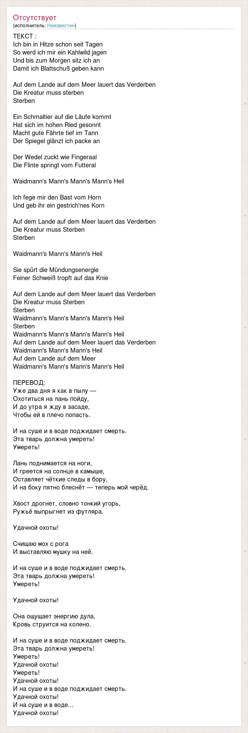 ТЕКСТ : Ich bin in Hitze schon seit Tagen So werd ich mir ein Kahlwild jagen Und bis zum Morgen sitz ich an Damit ich Blattschuß geben kann Auf dem Lande auf dem Meer lauert das Verderben Die Kreatur muss sterben Sterben Ein Schmaltier auf die Läufe kommt Hat sich im hohen Ried gesonnt Macht gute Fährte tief im Tann Der Spiegel glänzt ich packe an Der Wedel zuckt wie Fingeraal Die Flinte springt vom Futteral Waidmann's Mann's Mann's Mann's Heil Ich fege mir den Bast vom Horn Und geb ihr ein gestrich'nes Korn Auf dem Lande auf dem Meer lauert das Verderben Die Kreatur muss Sterben Sterben Waidmann's Mann's Mann's Heil Sie spürt die Mündungsenergie Feiner Schweiß tropft auf das Knie Auf dem Lande auf dem Meer lauert das Verderben Die Kreatur muss Sterben Sterben Waidmann's Mann's Mann's Mann's Heil Sterben Waidmann's Mann's Mann's Mann's Heil Auf dem Lande auf dem Meer lauert das Verderben Waidmann's Mann's Mann's Heil Auf dem Lande auf dem Meer Waidmann's Mann's Mann's Mann's Heil ПЕРЕВОД: Уже два дня я как в пылу — Охотиться на лань пойду, И до утра я жду в засаде, Чтобы ей в плечо попасть. И на суше и в воде поджидает смерть. Эта тварь должна умереть! Умереть! Лань поднимается на ноги, И греется на солнце в камыше, Оставляет чёткие следы в бору, И на боку пятно блеснёт — теперь мой черёд. Хвост дрогнет, словно тонкий угорь, Ружьё выпрыгнет из футляра. Удачной охоты! Счищаю мох с рога И выставляю мушку на неё. И на суше и в воде поджидает смерть. Эта тварь должна умереть! Умереть! Удачной охоты! Она ощущает энергию дула, Кровь струится на колено. И на суше и в воде поджидает смерть. Эта тварь должна умереть! Умереть! Удачной охоты! Умереть! Удачной охоты! И на суше и в воде поджидает смерть. Удачной охоты! И на суше и в воде... Удачной охоты!