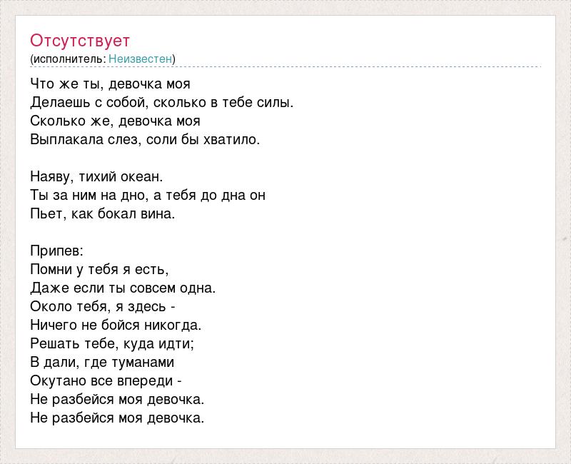 Что же ты, девочка моя Делаешь с собой, сколько в тебе силы. Сколько же, девочка моя Выплакала слез, соли бы хватило. Наяву, тихий океан. Ты за ним на дно, а тебя до дна он Пьет, как бокал вина. Припев: Помни у тебя я есть, Даже если ты совсем одна. Около тебя, я здесь - Ничего не бойся никогда. Решать тебе, куда идти; В дали, где туманами Окутано все впереди - Не разбейся моя девочка. Не разбейся моя девочка.