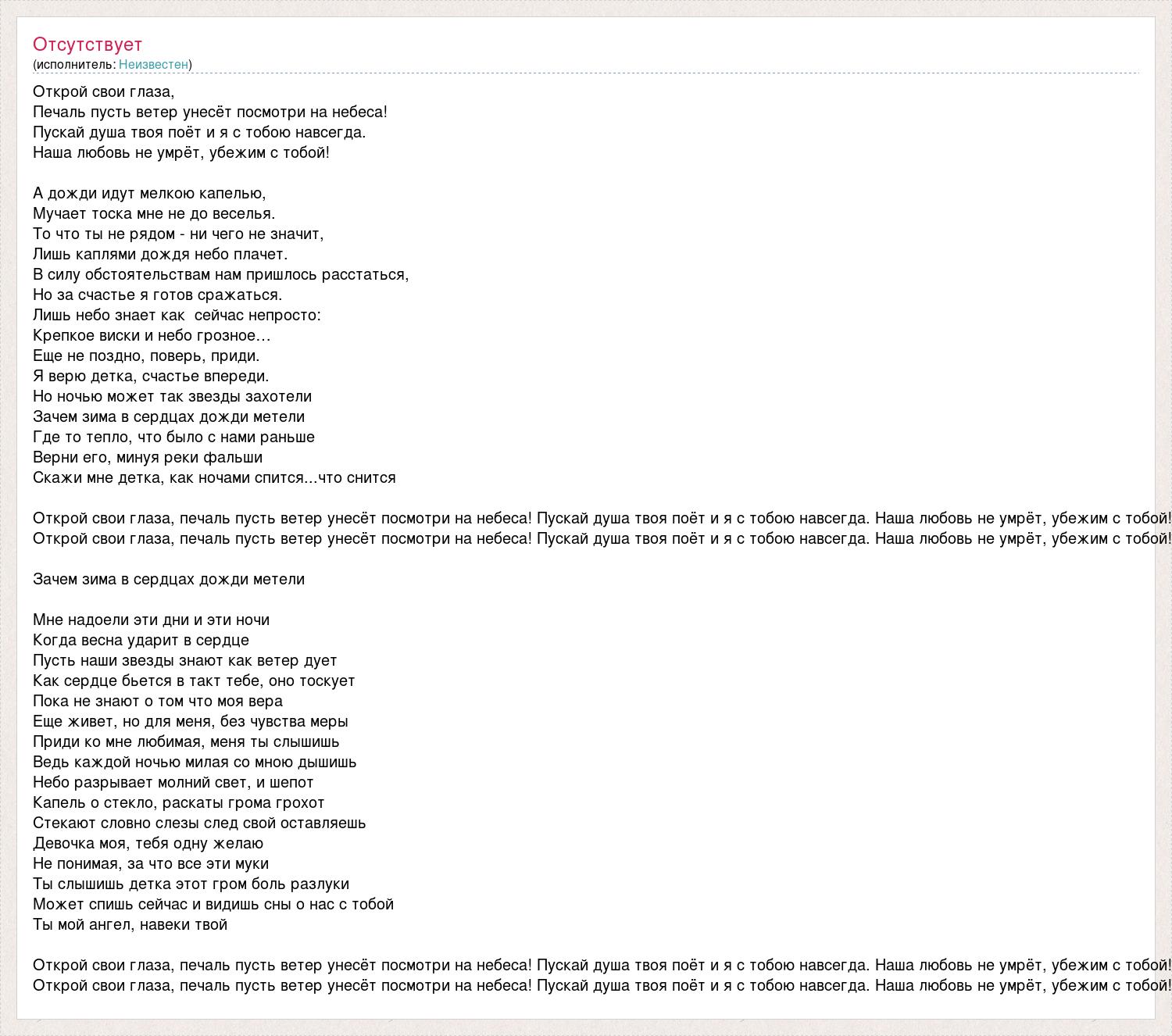 Открой свои глаза, Печаль пусть ветер унесёт посмотри на небеса! Пускай душа твоя поёт и я с тобою навсегда. Наша любовь не умрёт, убежим с тобой! А дожди идут мелкою капелью, Мучает тоска мне не до веселья. То что ты не рядом - ни чего не значит, Лишь каплями дождя небо плачет. В силу обстоятельствам нам пришлось расстаться, Но за счастье я готов сражаться. Лишь небо знает как сейчас непросто: Крепкое виски и небо грозное… Еще не поздно, поверь, приди. Я верю детка, счастье впереди. Но ночью может так звезды захотели Зачем зима в сердцах дожди метели Где то тепло, что было с нами раньше Верни его, минуя реки фальши Скажи мне детка, как ночами спится...что снится Открой свои глаза, печаль пусть ветер унесёт посмотри на небеса! Пускай душа твоя поёт и я с тобою навсегда. Наша любовь не умрёт, убежим с тобой! Открой свои глаза, печаль пусть ветер унесёт посмотри на небеса! Пускай душа твоя поёт и я с тобою навсегда. Наша любовь не умрёт, убежим с тобой! Зачем зима в сердцах дожди метели Мне надоели эти дни и эти ночи Когда весна ударит в сердце Пусть наши звезды знают как ветер дует Как сердце бьется в такт тебе, оно тоскует Пока не знают о том что моя вера Еще живет, но для меня, без чувства меры Приди ко мне любимая, меня ты слышишь Ведь каждой ночью милая со мною дышишь Небо разрывает молний свет, и шепот Капель о стекло, раскаты грома грохот Стекают словно слезы след свой оставляешь Девочка моя, тебя одну желаю Не понимая, за что все эти муки Ты слышишь детка этот гром боль разлуки Может спишь сейчас и видишь сны о нас с тобой Ты мой ангел, навеки твой Открой свои глаза, печаль пусть ветер унесёт посмотри на небеса! Пускай душа твоя поёт и я с тобою навсегда. Наша любовь не умрёт, убежим с тобой! Открой свои глаза, печаль пусть ветер унесёт посмотри на небеса! Пускай душа твоя поёт и я с тобою навсегда. Наша любовь не умрёт, убежим с тобой!