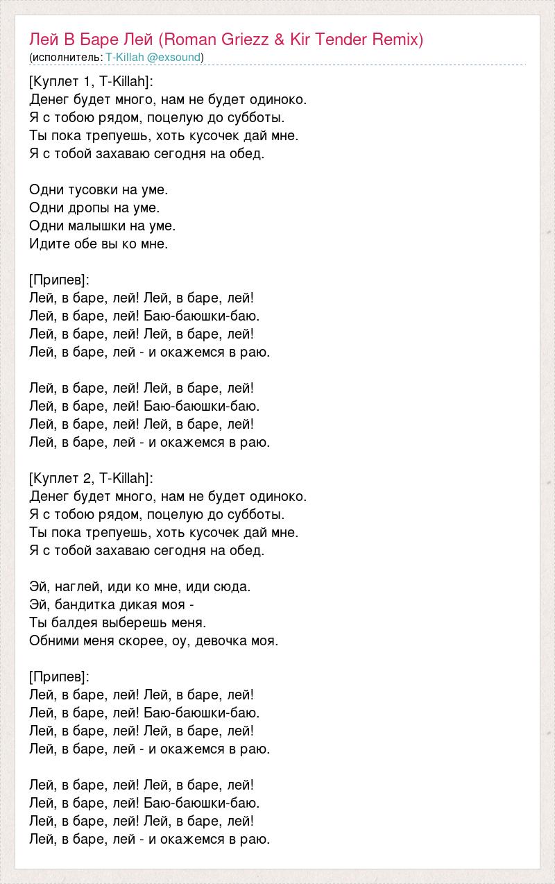[Куплет 1, T-Killah]: Денег будет много, нам не будет одиноко. Я с тобою рядом, поцелую до субботы. Ты пока трепуешь, хоть кусочек дай мне. Я с тобой захаваю сегодня на обед. Одни тусовки на уме. Одни дропы на уме. Одни малышки на уме. Идите обе вы ко мне. [Припев]: Лей, в баре, лей! Лей, в баре, лей! Лей, в баре, лей! Баю-баюшки-баю. Лей, в баре, лей! Лей, в баре, лей! Лей, в баре, лей - и окажемся в раю. Лей, в баре, лей! Лей, в баре, лей! Лей, в баре, лей! Баю-баюшки-баю. Лей, в баре, лей! Лей, в баре, лей! Лей, в баре, лей - и окажемся в раю. [Куплет 2, T-Killah]: Денег будет много, нам не будет одиноко. Я с тобою рядом, поцелую до субботы. Ты пока трепуешь, хоть кусочек дай мне. Я с тобой захаваю сегодня на обед. Эй, наглей, иди ко мне, иди сюда. Эй, бандитка дикая моя - Ты балдея выберешь меня. Обними меня скорее, оу, девочка моя. [Припев]: Лей, в баре, лей! Лей, в баре, лей! Лей, в баре, лей! Баю-баюшки-баю. Лей, в баре, лей! Лей, в баре, лей! Лей, в баре, лей - и окажемся в раю. Лей, в баре, лей! Лей, в баре, лей! Лей, в баре, лей! Баю-баюшки-баю. Лей, в баре, лей! Лей, в баре, лей! Лей, в баре, лей - и окажемся в раю.