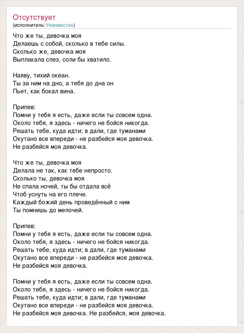 Что же ты, девочка моя Делаешь с собой, сколько в тебе силы. Сколько же, девочка моя Выплакала слез, соли бы хватило. Наяву, тихий океан. Ты за ним на дно, а тебя до дна он Пьет, как бокал вина. Припев: Помни у тебя я есть, даже если ты совсем одна. Около тебя, я здесь - ничего не бойся никогда. Решать тебе, куда идти; в дали, где туманами Окутано все впереди - не разбейся моя девочка. Не разбейся моя девочка. Что же ты, девочка моя Делала не так, как тебе непросто. Сколько ты, девочка моя Не спала ночей, ты бы отдала всё Чтоб уснуть на его плече. Каждый божий день проведённый с ним Ты помнишь до мелочей. Припев: Помни у тебя я есть, даже если ты совсем одна. Около тебя, я здесь - ничего не бойся никогда. Решать тебе, куда идти; в дали, где туманами Окутано все впереди - не разбейся моя девочка. Не разбейся моя девочка. Помни у тебя я есть, даже если ты совсем одна. Около тебя, я здесь - ничего не бойся никогда. Решать тебе, куда идти; в дали, где туманами Окутано все впереди - не разбейся моя девочка. Не разбейся моя девочка. Не разбейся, моя девочка.
