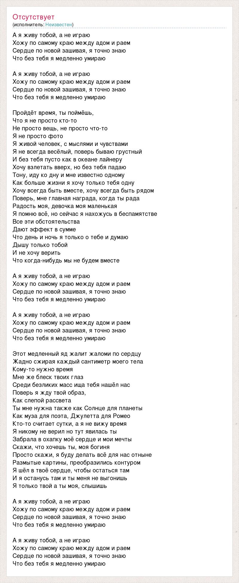 А я живу тобой, а не играю Хожу по самому краю между адом и раем Сердце по новой зашивая, я точно знаю Что без тебя я медленно умираю А я живу тобой, а не играю Хожу по самому краю между адом и раем Сердце по новой зашивая, я точно знаю Что без тебя я медленно умираю Пройдёт время, ты поймёшь, Что я не просто кто-то Не просто вещь, не просто что-то Я не просто фото Я живой человек, с мыслями и чувствами Я не всегда весёлый, поверь бываю грустный И без тебя пусто как в океане лайнеру Хочу взлетать вверх, но без тебя падаю Тону, иду ко дну и мне известно одному Как больше жизни я хочу только тебя одну Хочу всегда быть вместе, хочу всегда быть рядом Поверь, мне главная награда, когда ты рада Радость моя, девочка моя маленькая Я помню всё, но сейчас я нахожусь в беспамятстве Все эти обстоятельства Дают эффект в сумме Что день и ночь я только о тебе и думаю Дышу только тобой И не хочу верить Что когда-нибудь мы не будем вместе А я живу тобой, а не играю Хожу по самому краю между адом и раем Сердце по новой зашивая, я точно знаю Что без тебя я медленно умираю А я живу тобой, а не играю Хожу по самому краю между адом и раем Сердце по новой зашивая, я точно знаю Что без тебя я медленно умираю Этот медленный яд жалит жаломи по сердцу Жадно сжирая каждый сантиметр моего тела Кому-то нужно время Мне же блеск твоих глаз Среди безликих масс ища тебя нашёл нас Поверь я жду твой образ, Как слепой рассвета Ты мне нужна также как Солнце для планеты Как муза для поэта, Джулетта для Ромео Кто-то считает сутки, а я не вижу время Я никому не верил но тут явилась ты Забрала в охапку моё сердце и мои мечты Скажи, что хочешь ты, моя богиня Просто скажи, я буду делать всё для нас отныне Размытые картины, преобразились контуром Я шёл в твоё сердце, чтобы остаться там И я останусь там и ты меня не выгонишь Я только твой а ты моя, слышишь А я живу тобой, а не играю Хожу по самому краю между адом и раем Сердце по новой зашивая, я точно знаю Что без тебя я медленно умираю А я живу тобой, а не играю Хожу по самому краю между адом и раем Сердце по новой зашивая, я точно знаю Что без тебя я медленно умираю