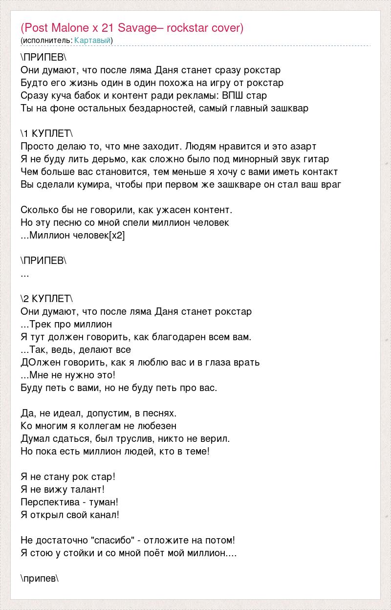 \ПРИПЕВ\ Они думают, что после ляма Даня станет сразу рокстар Будто его жизнь один в один похожа на игру от рокстар Сразу куча бабок и контент ради рекламы: ВПШ стар Ты на фоне остальных бездарностей, самый главный зашквар \1 КУПЛЕТ\ Просто делаю то, что мне заходит. Людям нравится и это азарт Я не буду лить дерьмо, как сложно было под минорный звук гитар Чем больше вас становится, тем меньше я хочу с вами иметь контакт Вы сделали кумира, чтобы при первом же зашкваре он стал ваш враг Сколько бы не говорили, как ужасен контент. Но эту песню со мной спели миллион человек ...Миллион человек[x2] \ПРИПЕВ\ ... \2 КУПЛЕТ\ Они думают, что после ляма Даня станет рокстар ...Трек про миллион Я тут должен говорить, как благодарен всем вам. ...Так, ведь, делают все ДОлжен говорить, как я люблю вас и в глаза врать ...Мне не нужно это! Буду петь с вами, но не буду петь про вас. Да, не идеал, допустим, в песнях. Ко многим я коллегам не любезен Думал сдаться, был труслив, никто не верил. Но пока есть миллион людей, кто в теме! Я не стану рок стар! Я не вижу талант! Перспектива - туман! Я открыл свой канал! Не достаточно "спасибо" - отложите на потом! Я стою у стойки и со мной поёт мой миллион.... \припев\