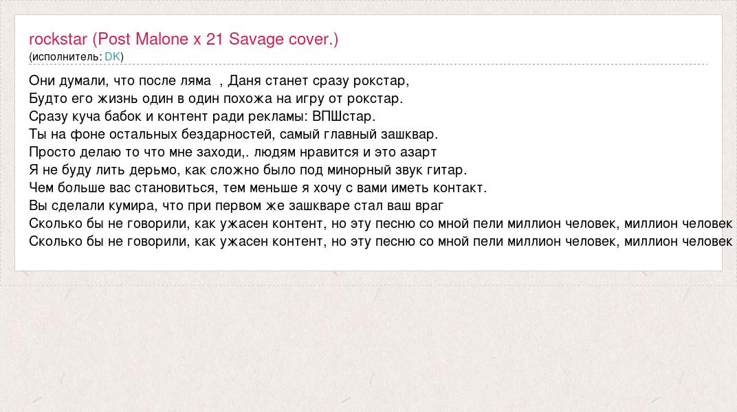 Они думали, что после ляма , Даня станет сразу рокстар, Будто его жизнь один в один похожа на игру от рокстар. Сразу куча бабок и контент ради рекламы: ВПШстар. Ты на фоне остальных бездарностей, самый главный зашквар. Просто делаю то что мне заходи,. людям нравится и это азарт Я не буду лить дерьмо, как сложно было под минорный звук гитар. Чем больше вас становиться, тем меньше я хочу с вами иметь контакт. Вы сделали кумира, что при первом же зашкваре стал ваш враг Сколько бы не говорили, как ужасен контент, но эту песню со мной пели миллион человек, миллион человек Сколько бы не говорили, как ужасен контент, но эту песню со мной пели миллион человек, миллион человек
