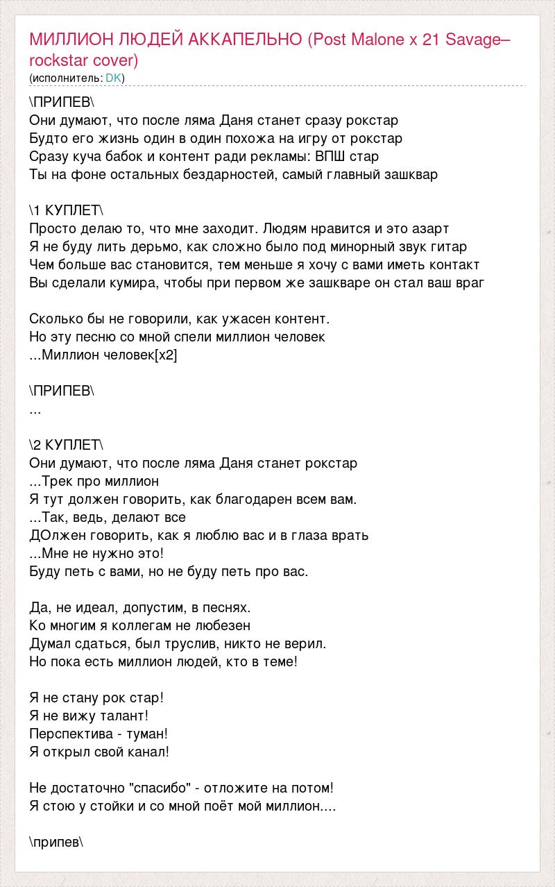 \ПРИПЕВ\ Они думают, что после ляма Даня станет сразу рокстар Будто его жизнь один в один похожа на игру от рокстар Сразу куча бабок и контент ради рекламы: ВПШ стар Ты на фоне остальных бездарностей, самый главный зашквар \1 КУПЛЕТ\ Просто делаю то, что мне заходит. Людям нравится и это азарт Я не буду лить дерьмо, как сложно было под минорный звук гитар Чем больше вас становится, тем меньше я хочу с вами иметь контакт Вы сделали кумира, чтобы при первом же зашкваре он стал ваш враг Сколько бы не говорили, как ужасен контент. Но эту песню со мной спели миллион человек ...Миллион человек[x2] \ПРИПЕВ\ ... \2 КУПЛЕТ\ Они думают, что после ляма Даня станет рокстар ...Трек про миллион Я тут должен говорить, как благодарен всем вам. ...Так, ведь, делают все ДОлжен говорить, как я люблю вас и в глаза врать ...Мне не нужно это! Буду петь с вами, но не буду петь про вас. Да, не идеал, допустим, в песнях. Ко многим я коллегам не любезен Думал сдаться, был труслив, никто не верил. Но пока есть миллион людей, кто в теме! Я не стану рок стар! Я не вижу талант! Перспектива - туман! Я открыл свой канал! Не достаточно "спасибо" - отложите на потом! Я стою у стойки и со мной поёт мой миллион.... \припев\