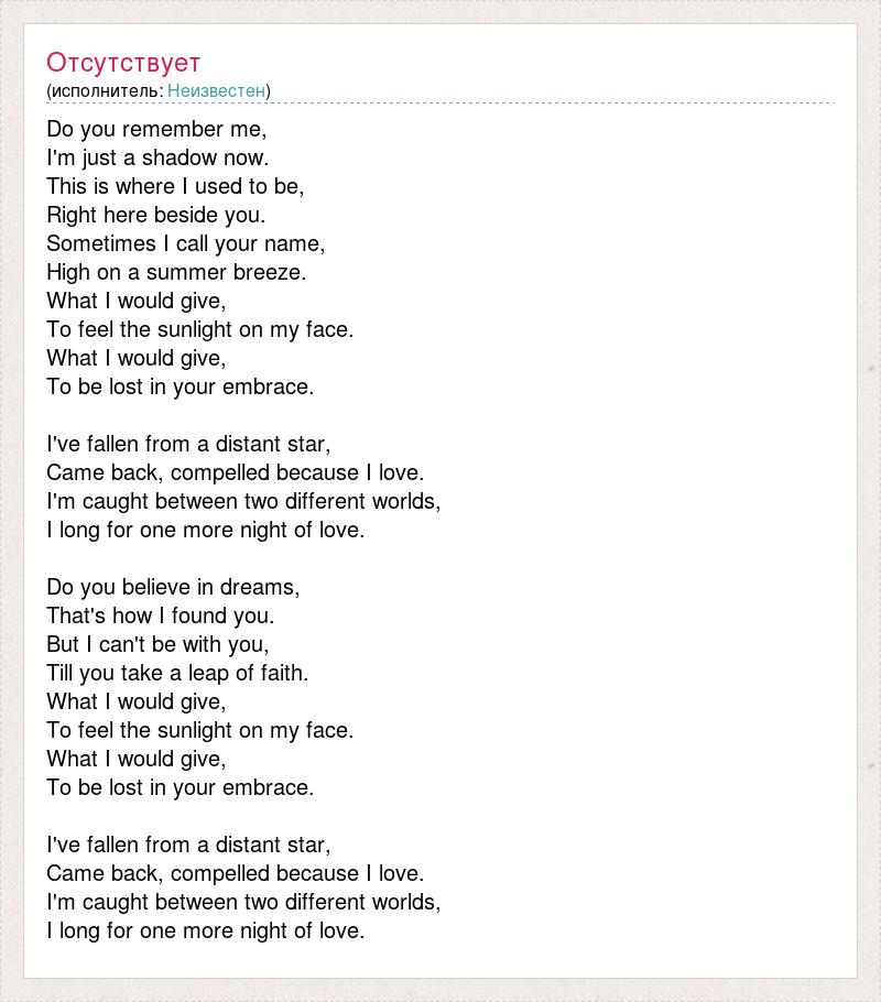 Do you remember me, I'm just a shadow now. This is where I used to be, Right here beside you. Sometimes I call your name, High on a summer breeze. What I would give, To feel the sunlight on my face. What I would give, To be lost in your embrace. I've fallen from a distant star, Came back, compelled because I love. I'm caught between two different worlds, I long for one more night of love. Do you believe in dreams, That's how I found you. But I can't be with you, Till you take a leap of faith. What I would give, To feel the sunlight on my face. What I would give, To be lost in your embrace. I've fallen from a distant star, Came back, compelled because I love. I'm caught between two different worlds, I long for one more night of love.