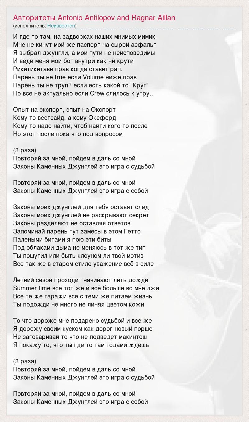 И где то там, на задворках наших мнимых мимик Мне не кинут мой же паспорт на сырой асфальт Я выбрал джунгли, а мои пути не неисповедимы И веди меня мой бог внутри как ни крути Рикитикитави прав когда ставит рап. Парень ты не true если Volume ниже прав Парень ты не труп? если есть какой то "Круг" Но все не актуально если Crew слилось к утру.. Опыт на экспорт, эпыт на Окспорт Кому то вестсайд, а кому Оксфорд Кому то надо найти, чтоб найти кого то после Но этот после пока что под вопросом (3 раза) Повторяй за мной, пойдем в даль со мной Законы Каменных Джунглей это игра с судьбой Повторяй за мной, пойдем в даль со мной Законы Каменных Джунглей это игра с собой Законы моих джунглей для тебя оставят след Законы моих джунглей не раскрывают секрет Законы разделяют не оставляя ответов Запоминай парень тут замесы в этом Гетто Палеными битами я пою эти биты Под облаками дыма не меняюсь в тот же тип Ты пошутил или быть клоуном ли твой мотив Все так же в старом стиле уважение всё в силе Летний сезон проходит начинают лить дожди Summer time все тот же и всё больше во мне лжи Все те же гаражи все с теми же питаем жизнь Ты подожди не много не линяя цветом кожи То что дороже мне подарено судьбой и все же Я дорожу своим куском как дорог новый порше Не заговаривай то что не подведет макинтош Я покажу то, что ты где то там годами ждешь (3 раза) Повторяй за мной, пойдем в даль со мной Законы Каменных Джунглей это игра с судьбой Повторяй за мной, пойдем в даль со мной Законы Каменных Джунглей это игра с собой