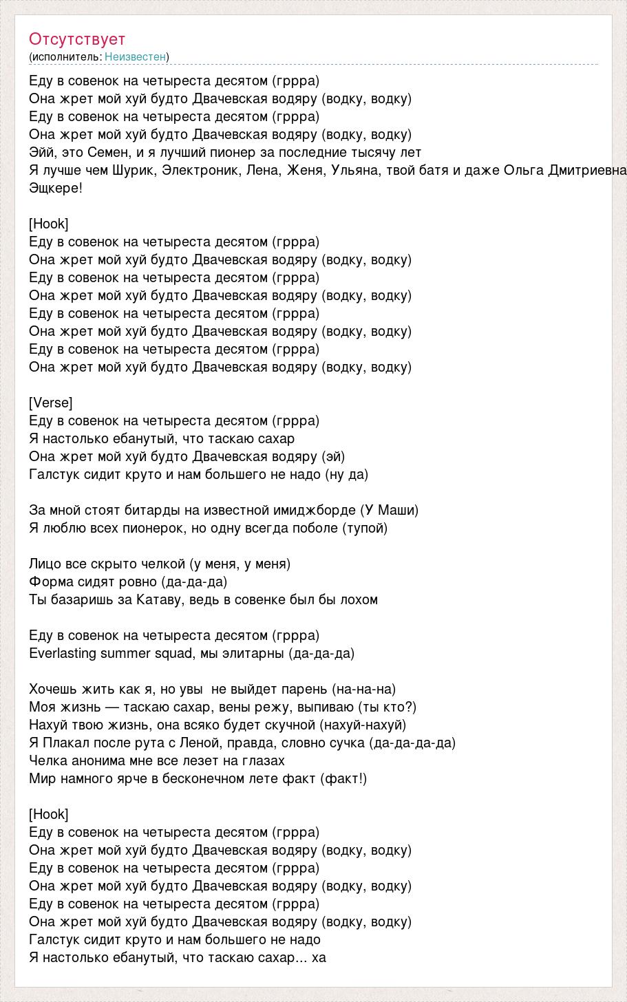 Еду в совенок на четыреста десятом (гррра) Она жрет мой хуй будто Двачевская водяру (водку, водку) Еду в совенок на четыреста десятом (гррра) Она жрет мой хуй будто Двачевская водяру (водку, водку) Эйй, это Семен, и я лучший пионер за последние тысячу лет Я лучше чем Шурик, Электроник, Лена, Женя, Ульяна, твой батя и даже Ольга Дмитриевна Эщкере! [Hook] Еду в совенок на четыреста десятом (гррра) Она жрет мой хуй будто Двачевская водяру (водку, водку) Еду в совенок на четыреста десятом (гррра) Она жрет мой хуй будто Двачевская водяру (водку, водку) Еду в совенок на четыреста десятом (гррра) Она жрет мой хуй будто Двачевская водяру (водку, водку) Еду в совенок на четыреста десятом (гррра) Она жрет мой хуй будто Двачевская водяру (водку, водку) [Verse] Еду в совенок на четыреста десятом (гррра) Я настолько ебанутый, что таскаю сахар Она жрет мой хуй будто Двачевская водяру (эй) Галстук сидит круто и нам большего не надо (ну да) За мной стоят битарды на известной имиджборде (У Маши) Я люблю всех пионерок, но одну всегда поболе (тупой) Лицо все скрыто челкой (у меня, у меня) Форма сидят ровно (да-да-да) Ты базаришь за Катаву, ведь в совенке был бы лохом Еду в совенок на четыреста десятом (гррра) Everlasting summer squad, мы элитарны (да-да-да) Хочешь жить как я, но увы не выйдет парень (на-на-на) Моя жизнь — таскаю сахар, вены режу, выпиваю (ты кто?) Нахуй твою жизнь, она всяко будет скучной (нахуй-нахуй) Я Плакал после рута с Леной, правда, словно сучка (да-да-да-да) Челка анонима мне все лезет на глазах Мир намного ярче в бесконечном лете факт (факт!) [Hook] Еду в совенок на четыреста десятом (гррра) Она жрет мой хуй будто Двачевская водяру (водку, водку) Еду в совенок на четыреста десятом (гррра) Она жрет мой хуй будто Двачевская водяру (водку, водку) Еду в совенок на четыреста десятом (гррра) Она жрет мой хуй будто Двачевская водяру (водку, водку) Галстук сидит круто и нам большего не надо Я настолько ебанутый, что таскаю сахар... ха