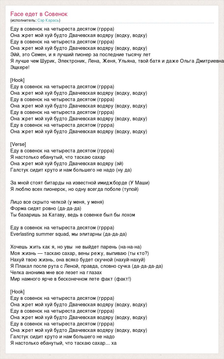 Еду в совенок на четыреста десятом (гррра) Она жрет мой хуй будто Двачевская водяру (водку, водку) Еду в совенок на четыреста десятом (гррра) Она жрет мой хуй будто Двачевская водяру (водку, водку) Эйй, это Семен, и я лучший пионер за последние тысячу лет Я лучше чем Шурик, Электроник, Лена, Женя, Ульяна, твой батя и даже Ольга Дмитриевна Эщкере! [Hook] Еду в совенок на четыреста десятом (гррра) Она жрет мой хуй будто Двачевская водяру (водку, водку) Еду в совенок на четыреста десятом (гррра) Она жрет мой хуй будто Двачевская водяру (водку, водку) Еду в совенок на четыреста десятом (гррра) Она жрет мой хуй будто Двачевская водяру (водку, водку) Еду в совенок на четыреста десятом (гррра) Она жрет мой хуй будто Двачевская водяру (водку, водку) [Verse] Еду в совенок на четыреста десятом (гррра) Я настолько ебанутый, что таскаю сахар Она жрет мой хуй будто Двачевская водяру (эй) Галстук сидит круто и нам большего не надо (ну да) За мной стоят битарды на известной имиджборде (У Маши) Я люблю всех пионерок, но одну всегда поболе (тупой) Лицо все скрыто челкой (у меня, у меня) Форма сидят ровно (да-да-да) Ты базаришь за Катаву, ведь в совенке был бы лохом Еду в совенок на четыреста десятом (гррра) Everlasting summer squad, мы элитарны (да-да-да) Хочешь жить как я, но увы не выйдет парень (на-на-на) Моя жизнь — таскаю сахар, вены режу, выпиваю (ты кто?) Нахуй твою жизнь, она всяко будет скучной (нахуй-нахуй) Я Плакал после рута с Леной, правда, словно сучка (да-да-да-да) Челка анонима мне все лезет на глазах Мир намного ярче в бесконечном лете факт (факт!) [Hook] Еду в совенок на четыреста десятом (гррра) Она жрет мой хуй будто Двачевская водяру (водку, водку) Еду в совенок на четыреста десятом (гррра) Она жрет мой хуй будто Двачевская водяру (водку, водку) Еду в совенок на четыреста десятом (гррра) Она жрет мой хуй будто Двачевская водяру (водку, водку) Галстук сидит круто и нам большего не надо Я настолько ебанутый, что таскаю сахар... ха