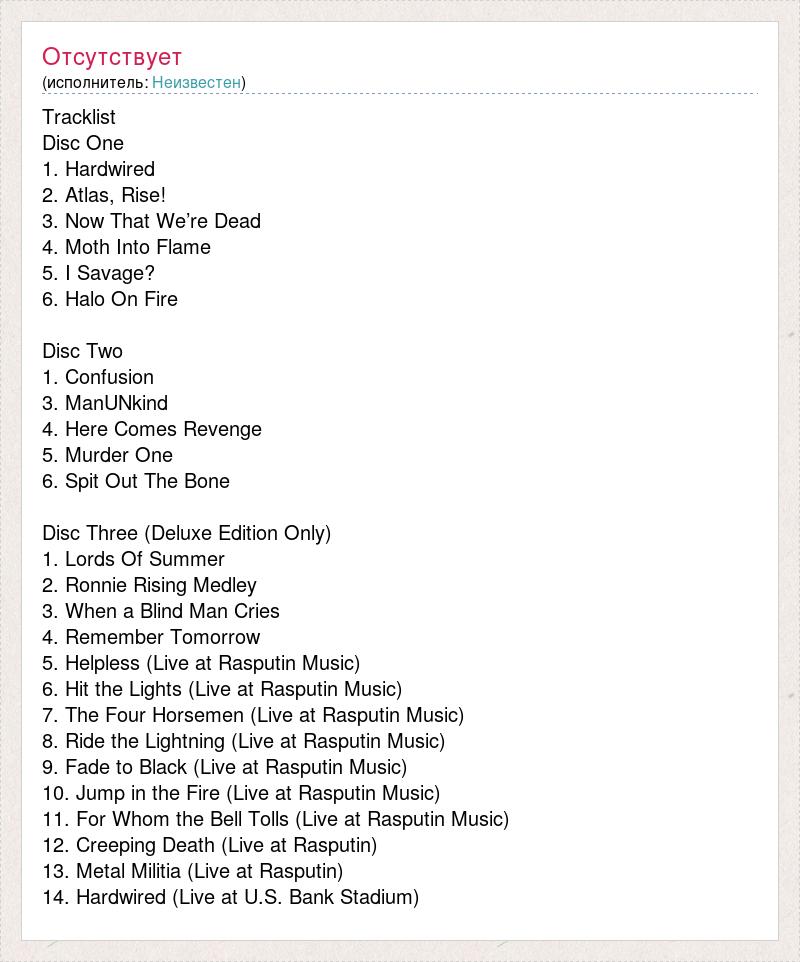 Tracklist Disc One 1. Hardwired 2. Atlas, Rise! 3. Now That We’re Dead 4. Moth Into Flame 5. I Savage? 6. Halo On Fire Disc Two 1. Confusion 3. ManUNkind 4. Here Comes Revenge 5. Murder One 6. Spit Out The Bone Disc Three (Deluxe Edition Only) 1. Lords Of Summer 2. Ronnie Rising Medley 3. When a Blind Man Cries 4. Remember Tomorrow 5. Helpless (Live at Rasputin Music) 6. Hit the Lights (Live at Rasputin Music) 7. The Four Horsemen (Live at Rasputin Music) 8. Ride the Lightning (Live at Rasputin Music) 9. Fade to Black (Live at Rasputin Music) 10. Jump in the Fire (Live at Rasputin Music) 11. For Whom the Bell Tolls (Live at Rasputin Music) 12. Creeping Death (Live at Rasputin) 13. Metal Militia (Live at Rasputin) 14. Hardwired (Live at U.S. Bank Stadium)