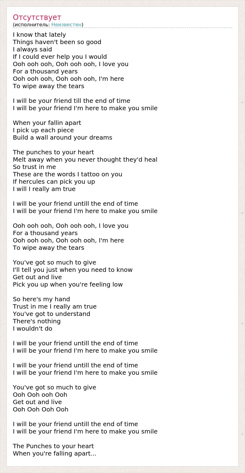 I know that lately Things haven't been so good I always said If I could ever help you I would Ooh ooh ooh, Ooh ooh ooh, I love you For a thousand years Ooh ooh ooh, Ooh ooh ooh, I'm here To wipe away the tears I will be your friend till the end of time I will be your friend I'm here to make you smile When your fallin apart I pick up each piece Build a wall around your dreams The punches to your heart Melt away when you never thought they'd heal So trust in me These are the words I tattoo on you If hercules can pick you up I will I really am true I will be your friend untill the end of time I will be your friend I'm here to make you smile Ooh ooh ooh, Ooh ooh ooh, I love you For a thousand years Ooh ooh ooh, Ooh ooh ooh, I'm here To wipe away the tears You've got so much to give I'll tell you just when you need to know Get out and live Pick you up when you're feeling low So here's my hand Trust in me I really am true You've got to understand There's nothing I wouldn't do I will be your friend untill the end of time I will be your friend I'm here to make you smile I will be your friend untill the end of time I will be your friend I'm here to make you smile You've got so much to give Ooh Ooh ooh Ooh Get out and live Ooh Ooh Ooh Ooh I will be your friend untill the end of time I will be your friend I'm here to make you smile The Punches to your heart When you're falling apart...
