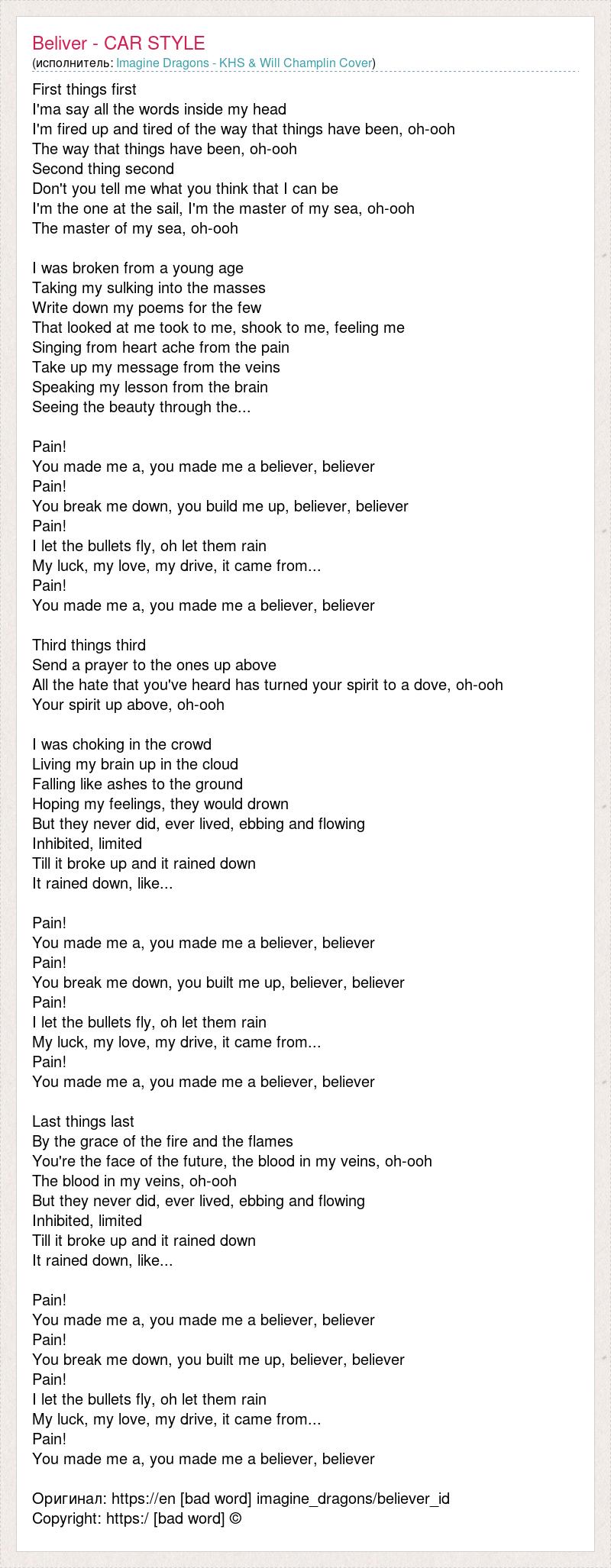 First things first I'ma say all the words inside my head I'm fired up and tired of the way that things have been, oh-ooh The way that things have been, oh-ooh Second thing second Don't you tell me what you think that I can be I'm the one at the sail, I'm the master of my sea, oh-ooh The master of my sea, oh-ooh I was broken from a young age Taking my sulking into the masses Write down my poems for the few That looked at me took to me, shook to me, feeling me Singing from heart ache from the pain Take up my message from the veins Speaking my lesson from the brain Seeing the beauty through the... Pain! You made me a, you made me a believer, believer Pain! You break me down, you build me up, believer, believer Pain! I let the bullets fly, oh let them rain My luck, my love, my drive, it came from... Pain! You made me a, you made me a believer, believer Third things third Send a prayer to the ones up above All the hate that you've heard has turned your spirit to a dove, oh-ooh Your spirit up above, oh-ooh I was choking in the crowd Living my brain up in the cloud Falling like ashes to the ground Hoping my feelings, they would drown But they never did, ever lived, ebbing and flowing Inhibited, limited Till it broke up and it rained down It rained down, like... Pain! You made me a, you made me a believer, believer Pain! You break me down, you built me up, believer, believer Pain! I let the bullets fly, oh let them rain My luck, my love, my drive, it came from... Pain! You made me a, you made me a believer, believer Last things last By the grace of the fire and the flames You're the face of the future, the blood in my veins, oh-ooh The blood in my veins, oh-ooh But they never did, ever lived, ebbing and flowing Inhibited, limited Till it broke up and it rained down It rained down, like... Pain! You made me a, you made me a believer, believer Pain! You break me down, you built me up, believer, believer Pain! I let the bullets fly, oh let them rain My luck, my love, my drive, it came from... Pain! You made me a, you made me a believer, believer Оригинал: https://en [bad word] imagine_dragons/believer_id Copyright: https:/ [bad word] ©