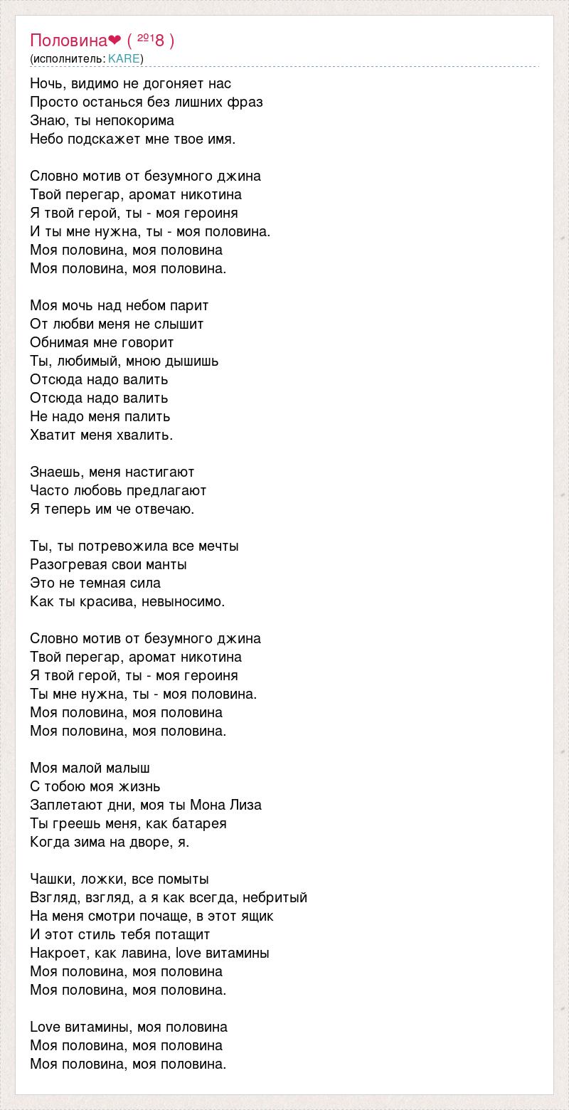 Ночь, видимо не догоняет нас Просто останься без лишних фраз Знаю, ты непокорима Небо подскажет мне твое имя. Словно мотив от безумного джина Твой перегар, аромат никотина Я твой герой, ты - моя героиня И ты мне нужна, ты - моя половина. Моя половина, моя половина Моя половина, моя половина. Моя мочь над небом парит От любви меня не слышит Обнимая мне говорит Ты, любимый, мною дышишь Отсюда надо валить Отсюда надо валить Не надо меня палить Хватит меня хвалить. Знаешь, меня настигают Часто любовь предлагают Я теперь им че отвечаю. Ты, ты потревожила все мечты Разогревая свои манты Это не темная сила Как ты красива, невыносимо. Словно мотив от безумного джина Твой перегар, аромат никотина Я твой герой, ты - моя героиня Ты мне нужна, ты - моя половина. Моя половина, моя половина Моя половина, моя половина. Моя малой малыш С тобою моя жизнь Заплетают дни, моя ты Мона Лиза Ты греешь меня, как батарея Когда зима на дворе, я. Чашки, ложки, все помыты Взгляд, взгляд, а я как всегда, небритый На меня смотри почаще, в этот ящик И этот стиль тебя потащит Накроет, как лавина, love витамины Моя половина, моя половина Моя половина, моя половина. Love витамины, моя половина Моя половина, моя половина Моя половина, моя половина.