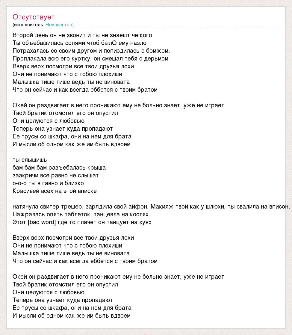 Второй день он не звонит и ты не знаешт че кого Ты объебашилась солями чтоб былО ему назло Потрахалась со своим другом и попиздилась с бомжом. Проплакала всю его куртку, он смешал тебя с дерьмом Вверх верх посмотри все твои друзья лохи Они не понимают что с тобою плохиши Малышка тише тише ведь ты не виновата Что он сейчас и как всегда еббется с твоим братом Окей он раздвигает в него проникают ему не больно знает, уже не играет Твой братик отомстил его он опустил Они целуются с любовью Теперь она узнает куда пропадают Ее трусы со шкафа, они на нем для брата И мысли об одном как же им быть вдвоем ты слышишь бам бам бам разъебалась крыша заакричи все равно не слышат о-о-о ты в гавно и близко Красивей всех на этой вписке натянула свитер трешер, зарядила свой айфон. Макияж твой как у шлюхи, ты свалила на вписон. Нажралась опять таблеток, танцевла на костях Этот [bad word] где то плачет он танцует на хуях Вверх верх посмотри все твои друзья лохи Они не понимают что с тобою плохиши Малышка тише тише ведь ты не виновата Что он сейчас и как всегда еббется с твоим братом Окей он раздвигает в него проникают ему не больно знает, уже не играет Твой братик отомстил его он опустил Они целуются с любовью Теперь она узнает куда пропадают Ее трусы со шкафа, они на нем для брата И мысли об одном как же им быть вдвоем