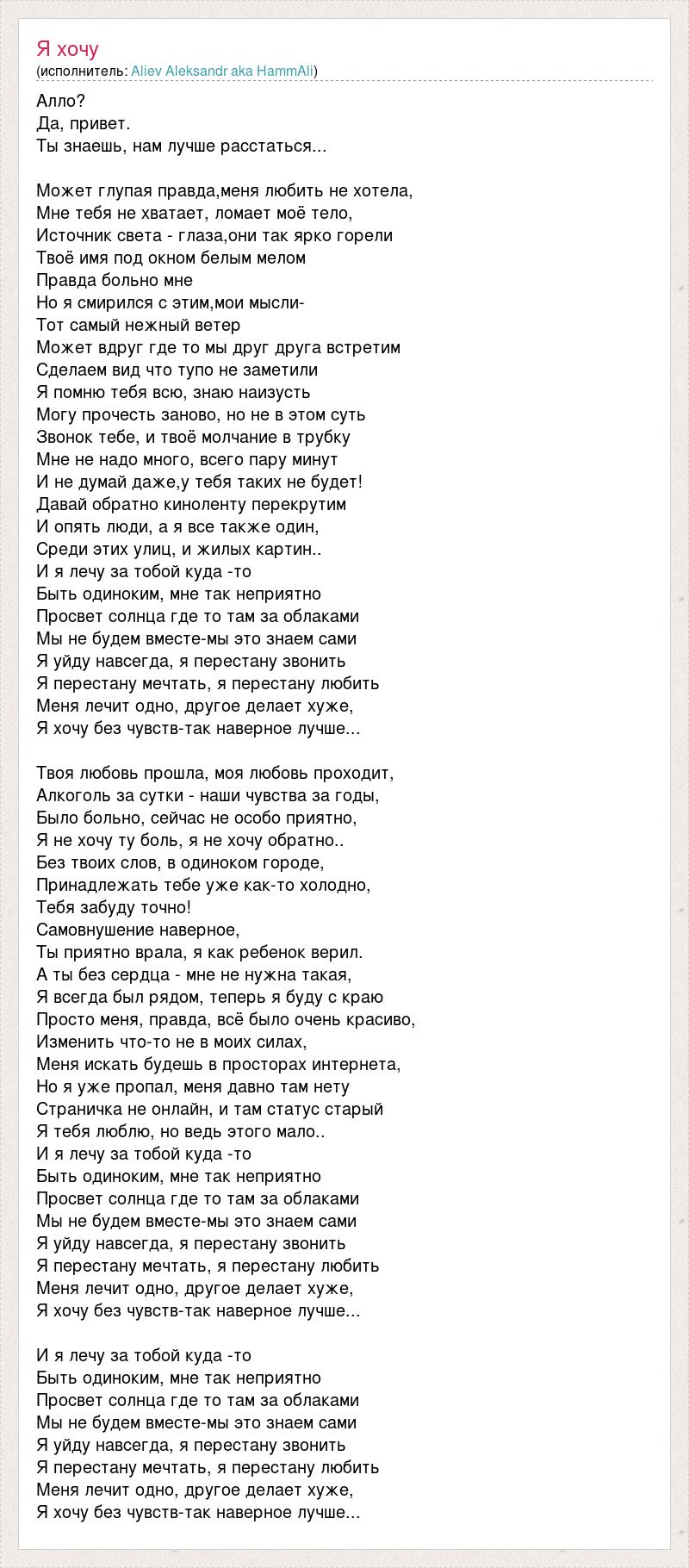 Алло? Да, привет. Ты знаешь, нам лучше расстаться... Может глупая правда,меня любить не хотела, Мне тебя не хватает, ломает моё тело, Источник света - глаза,они так ярко горели Твоё имя под окном белым мелом Правда больно мне Но я смирился с этим,мои мысли- Тот самый нежный ветер Может вдруг где то мы друг друга встретим Сделаем вид что тупо не заметили Я помню тебя всю, знаю наизусть Могу прочесть заново, но не в этом суть Звонок тебе, и твоё молчание в трубку Мне не надо много, всего пару минут И не думай даже,у тебя таких не будет! Давай обратно киноленту перекрутим И опять люди, а я все также один, Среди этих улиц, и жилых картин.. И я лечу за тобой куда -то Быть одиноким, мне так неприятно Просвет солнца где то там за облаками Мы не будем вместе-мы это знаем сами Я уйду навсегда, я перестану звонить Я перестану мечтать, я перестану любить Меня лечит одно, другое делает хуже, Я хочу без чувств-так наверное лучше... Твоя любовь прошла, моя любовь проходит, Алкоголь за сутки - наши чувства за годы, Было больно, сейчас не особо приятно, Я не хочу ту боль, я не хочу обратно.. Без твоих слов, в одиноком городе, Принадлежать тебе уже как-то холодно, Тебя забуду точно! Самовнушение наверное, Ты приятно врала, я как ребенок верил. А ты без сердца - мне не нужна такая, Я всегда был рядом, теперь я буду с краю Просто меня, правда, всё было очень красиво, Изменить что-то не в моих силах, Меня искать будешь в просторах интернета, Но я уже пропал, меня давно там нету Страничка не онлайн, и там статус старый Я тебя люблю, но ведь этого мало.. И я лечу за тобой куда -то Быть одиноким, мне так неприятно Просвет солнца где то там за облаками Мы не будем вместе-мы это знаем сами Я уйду навсегда, я перестану звонить Я перестану мечтать, я перестану любить Меня лечит одно, другое делает хуже, Я хочу без чувств-так наверное лучше... И я лечу за тобой куда -то Быть одиноким, мне так неприятно Просвет солнца где то там за облаками Мы не будем вместе-мы это знаем сами Я уйду навсегда, я перестану звонить Я перестану мечтать, я перестану любить Меня лечит одно, другое делает хуже, Я хочу без чувств-так наверное лучше...