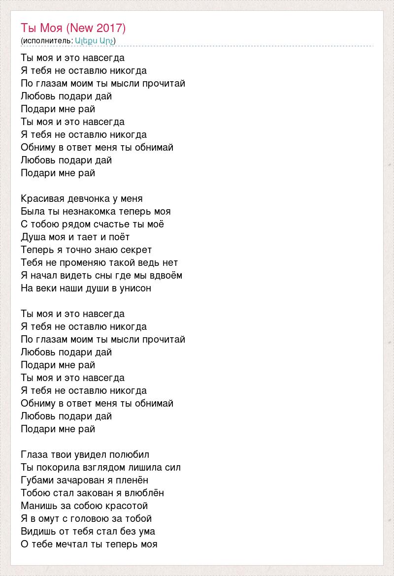 Ты моя и это навсегда Я тебя не оставлю никогда По глазам моим ты мысли прочитай Любовь подари дай Подари мне рай Ты моя и это навсегда Я тебя не оставлю никогда Обниму в ответ меня ты обнимай Любовь подари дай Подари мне рай Красивая девчонка у меня Была ты незнакомка теперь моя С тобою рядом счастье ты моё Душа моя и тает и поёт Теперь я точно знаю секрет Тебя не променяю такой ведь нет Я начал видеть сны где мы вдвоём На веки наши души в унисон Ты моя и это навсегда Я тебя не оставлю никогда По глазам моим ты мысли прочитай Любовь подари дай Подари мне рай Ты моя и это навсегда Я тебя не оставлю никогда Обниму в ответ меня ты обнимай Любовь подари дай Подари мне рай Глаза твои увидел полюбил Ты покорила взглядом лишила сил Губами зачарован я пленён Тобою стал закован я влюблён Манишь за собою красотой Я в омут с головою за тобой Видишь от тебя стал без ума О тебе мечтал ты теперь моя