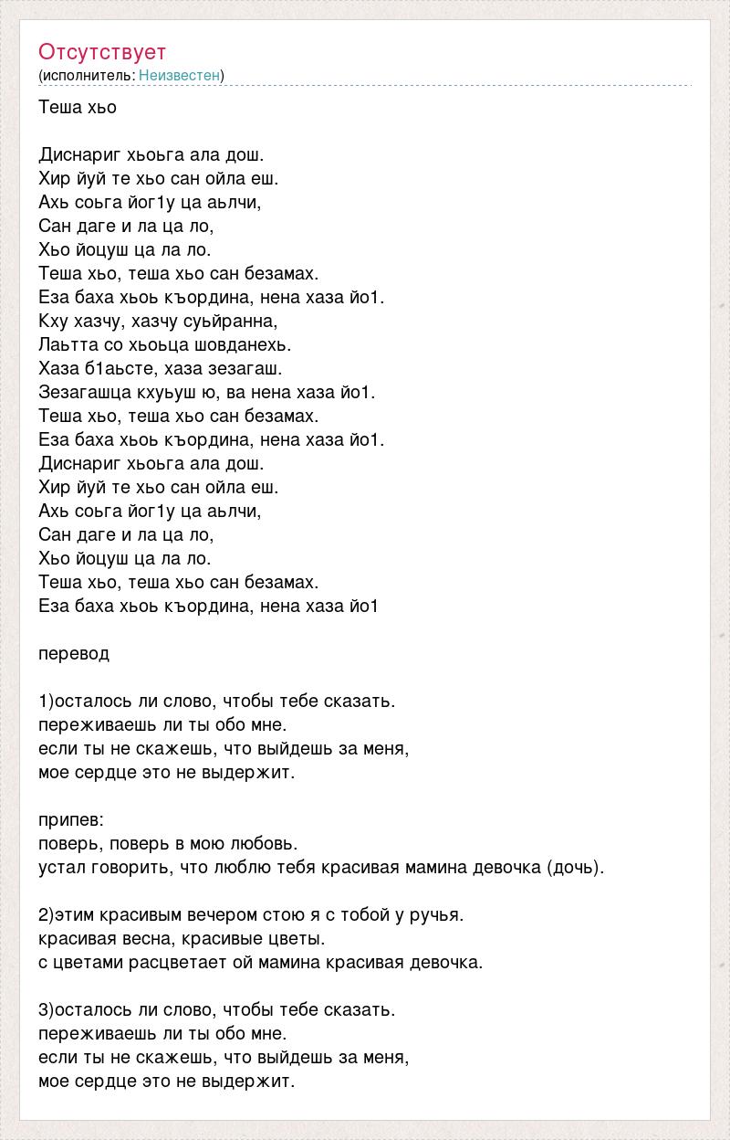 Теша хьо Диснариг хьоьга ала дош. Хир йуй те хьо сан ойла еш. Ахь соьга йог1у ца аьлчи, Сан даге и ла ца ло, Хьо йоцуш ца ла ло. Теша хьо, теша хьо сан безамах. Еза баха хьоь къордина, нена хаза йо1. Кху хазчу, хазчу суьйранна, Лаьтта со хьоьца шовданехь. Хаза б1аьсте, хаза зезагаш. Зезагашца кхуьуш ю, ва нена хаза йо1. Теша хьо, теша хьо сан безамах. Еза баха хьоь къордина, нена хаза йо1. Диснариг хьоьга ала дош. Хир йуй те хьо сан ойла еш. Ахь соьга йог1у ца аьлчи, Сан даге и ла ца ло, Хьо йоцуш ца ла ло. Теша хьо, теша хьо сан безамах. Еза баха хьоь къордина, нена хаза йо1 перевод 1)осталось ли слово, чтобы тебе сказать. переживаешь ли ты обо мне. если ты не скажешь, что выйдешь за меня, мое сердце это не выдержит. припев: поверь, поверь в мою любовь. устал говорить, что люблю тебя красивая мамина девочка (дочь). 2)этим красивым вечером стою я с тобой у ручья. красивая весна, красивые цветы. с цветами расцветает ой мамина красивая девочка. 3)осталось ли слово, чтобы тебе сказать. переживаешь ли ты обо мне. если ты не скажешь, что выйдешь за меня, мое сердце это не выдержит.