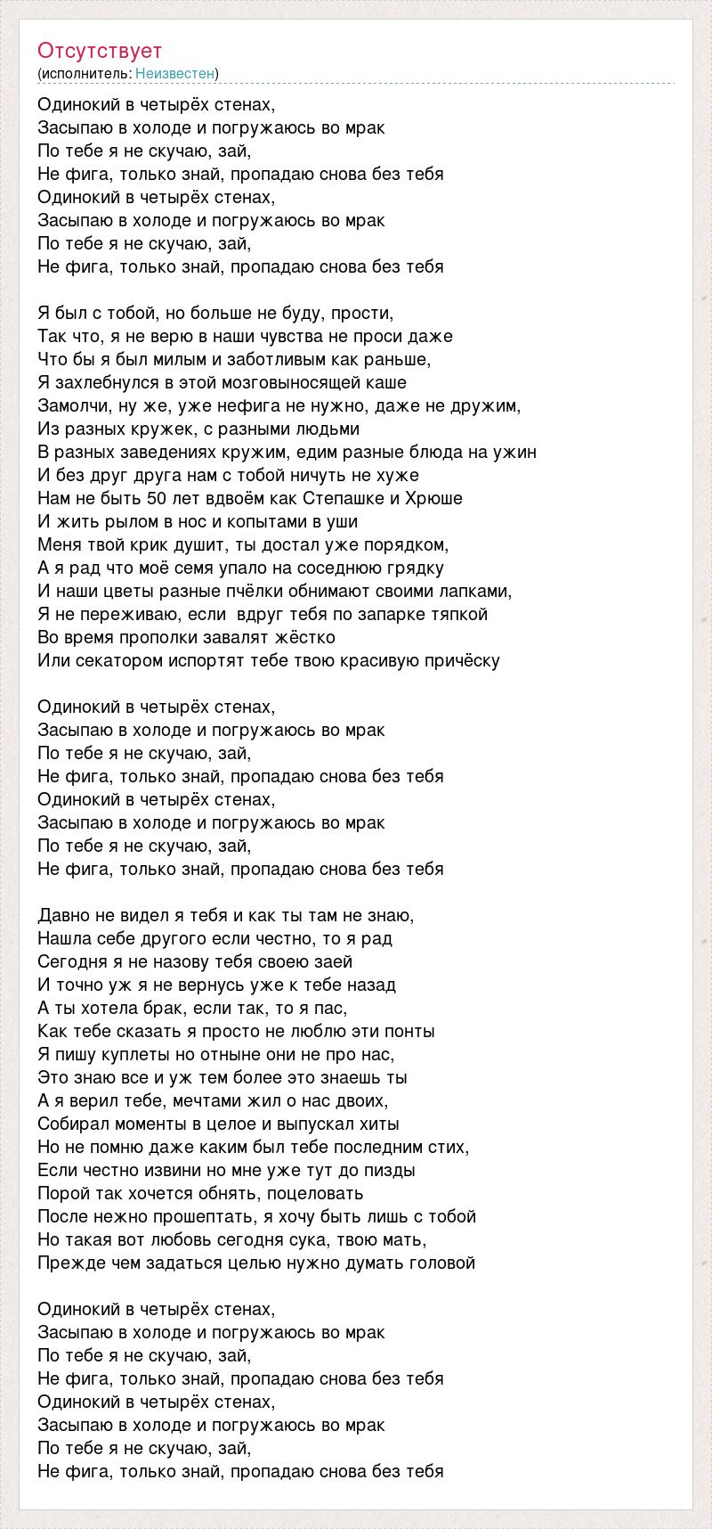 Одинокий в четырёх стенах, Засыпаю в холоде и погружаюсь во мрак По тебе я не скучаю, зай, Не фига, только знай, пропадаю снова без тебя Одинокий в четырёх стенах, Засыпаю в холоде и погружаюсь во мрак По тебе я не скучаю, зай, Не фига, только знай, пропадаю снова без тебя Я был с тобой, но больше не буду, прости, Так что, я не верю в наши чувства не проси даже Что бы я был милым и заботливым как раньше, Я захлебнулся в этой мозговыносящей каше Замолчи, ну же, уже нефига не нужно, даже не дружим, Из разных кружек, с разными людьми В разных заведениях кружим, едим разные блюда на ужин И без друг друга нам с тобой ничуть не хуже Нам не быть 50 лет вдвоём как Степашке и Хрюше И жить рылом в нос и копытами в уши Меня твой крик душит, ты достал уже порядком, А я рад что моё семя упало на соседнюю грядку И наши цветы разные пчёлки обнимают своими лапками, Я не переживаю, если вдруг тебя по запарке тяпкой Во время прополки завалят жёстко Или секатором испортят тебе твою красивую причёску Одинокий в четырёх стенах, Засыпаю в холоде и погружаюсь во мрак По тебе я не скучаю, зай, Не фига, только знай, пропадаю снова без тебя Одинокий в четырёх стенах, Засыпаю в холоде и погружаюсь во мрак По тебе я не скучаю, зай, Не фига, только знай, пропадаю снова без тебя Давно не видел я тебя и как ты там не знаю, Нашла себе другого если честно, то я рад Сегодня я не назову тебя своею заей И точно уж я не вернусь уже к тебе назад А ты хотела брак, если так, то я пас, Как тебе сказать я просто не люблю эти понты Я пишу куплеты но отныне они не про нас, Это знаю все и уж тем более это знаешь ты А я верил тебе, мечтами жил о нас двоих, Собирал моменты в целое и выпускал хиты Но не помню даже каким был тебе последним стих, Если честно извини но мне уже тут до пизды Порой так хочется обнять, поцеловать После нежно прошептать, я хочу быть лишь с тобой Но такая вот любовь сегодня сука, твою мать, Прежде чем задаться целью нужно думать головой Одинокий в четырёх стенах, Засыпаю в холоде и погружаюсь во мрак По тебе я не скучаю, зай, Не фига, только знай, пропадаю снова без тебя Одинокий в четырёх стенах, Засыпаю в холоде и погружаюсь во мрак По тебе я не скучаю, зай, Не фига, только знай, пропадаю снова без тебя