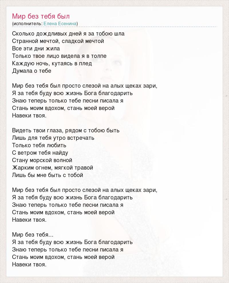 Сколько дождливых дней я за тобою шла Странной мечтой, сладкой мечтой Все эти дни жила Только твое лицо видела я в толпе Каждую ночь, кутаясь в плед Думала о тебе Мир без тебя был просто слезой на алых щеках зари, Я за тебя буду всю жизнь Бога благодарить Знаю теперь только тебе песни писала я Стань моим вдохом, стань моей верой Навеки твоя. Видеть твои глаза, рядом с тобою быть Лишь для тебя утро встречать Только тебя любить С ветром тебя найду Стану морской волной Жарким огнем, мягкой травой Лишь бы мне быть с тобой Мир без тебя был просто слезой на алых щеках зари, Я за тебя буду всю жизнь Бога благодарить Знаю теперь только тебе песни писала я Стань моим вдохом, стань моей верой Навеки твоя. Мир без тебя... Я за тебя буду всю жизнь Бога благодарить Знаю теперь только тебе песни писала я Стань моим вдохом, стань моей верой Навеки твоя.
