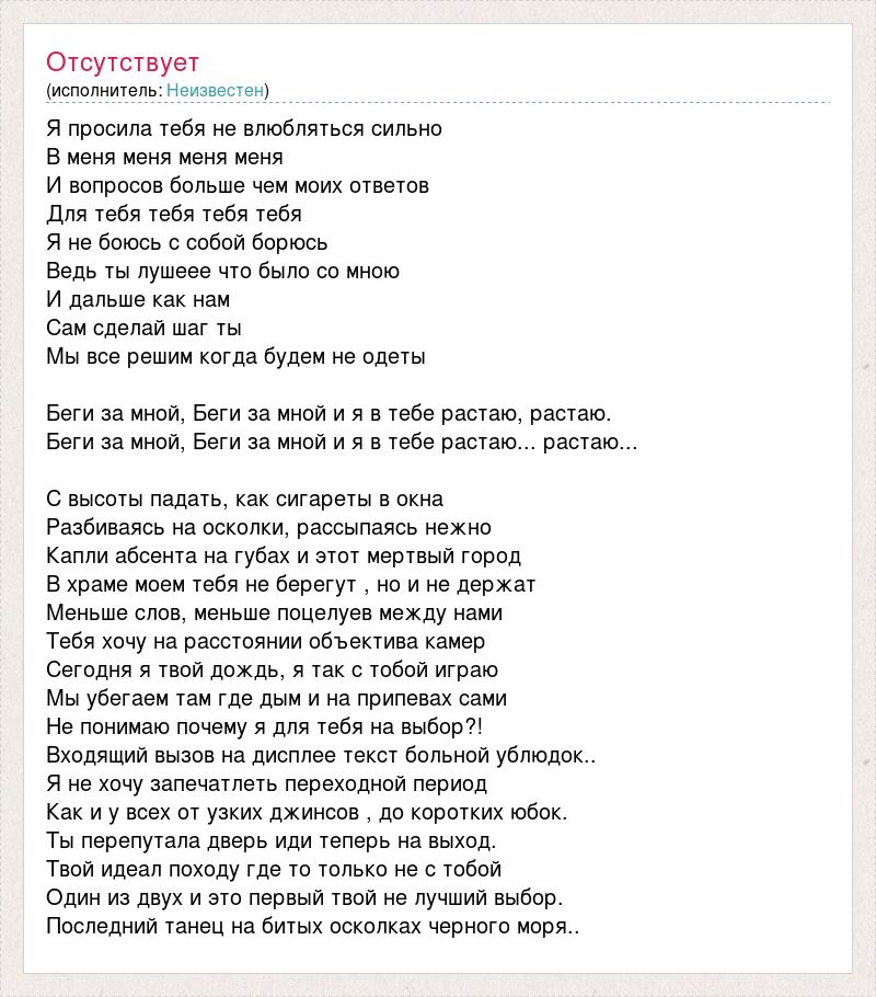 Я просила тебя не влюбляться сильно В меня меня меня меня И вопросов больше чем моих ответов Для тебя тебя тебя тебя Я не боюсь с собой борюсь Ведь ты лушеее что было со мною И дальше как нам Сам сделай шаг ты Мы все решим когда будем не одеты Беги за мной, Беги за мной и я в тебе растаю, растаю. Беги за мной, Беги за мной и я в тебе растаю... растаю... С высоты падать, как сигареты в окна Разбиваясь на осколки, рассыпаясь нежно Капли абсента на губах и этот мертвый город В храме моем тебя не берегут , но и не держат Меньше слов, меньше поцелуев между нами Тебя хочу на расстоянии объектива камер Сегодня я твой дождь, я так с тобой играю Мы убегаем там где дым и на припевах сами Не понимаю почему я для тебя на выбор?! Входящий вызов на дисплее текст больной ублюдок.. Я не хочу запечатлеть переходной период Как и у всех от узких джинсов , до коротких юбок. Ты перепутала дверь иди теперь на выход. Твой идеал походу где то только не с тобой Один из двух и это первый твой не лучший выбор. Последний танец на битых осколках черного моря..