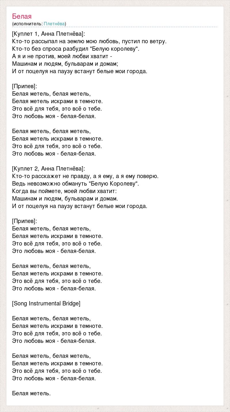 [Куплет 1, Анна Плетнёва]: Кто-то рассыпал на землю мою любовь, пустил по ветру. Кто-то без спроса разбудил "Белую королеву". А я и не против, моей любви хватит - Машинам и людям, бульварам и домам; И от поцелуя на паузу встанут белые мои города. [Припев]: Белая метель, белая метель, Белая метель искрами в темноте. Это всё для тебя, это всё о тебе. Это любовь моя - белая-белая. Белая метель, белая метель, Белая метель искрами в темноте. Это всё для тебя, это всё о тебе. Это любовь моя - белая-белая. [Куплет 2, Анна Плетнёва]: Кто-то расскажет не правду, а я ему, а я ему поверю. Ведь невозможно обмануть "Белую Королеву". Когда вы поймете, моей любви хватит: Машинам и людям, бульварам и домам. И от поцелуя на паузу встанут белые мои города. [Припев]: Белая метель, белая метель, Белая метель искрами в темноте. Это всё для тебя, это всё о тебе. Это любовь моя - белая-белая. Белая метель, белая метель, Белая метель искрами в темноте. Это всё для тебя, это всё о тебе. Это любовь моя - белая-белая. [Song Instrumental Bridge] Белая метель, белая метель, Белая метель искрами в темноте. Это всё для тебя, это всё о тебе. Это любовь моя - белая-белая. Белая метель, белая метель, Белая метель искрами в темноте. Это всё для тебя, это всё о тебе. Это любовь моя - белая-белая. Белая метель.