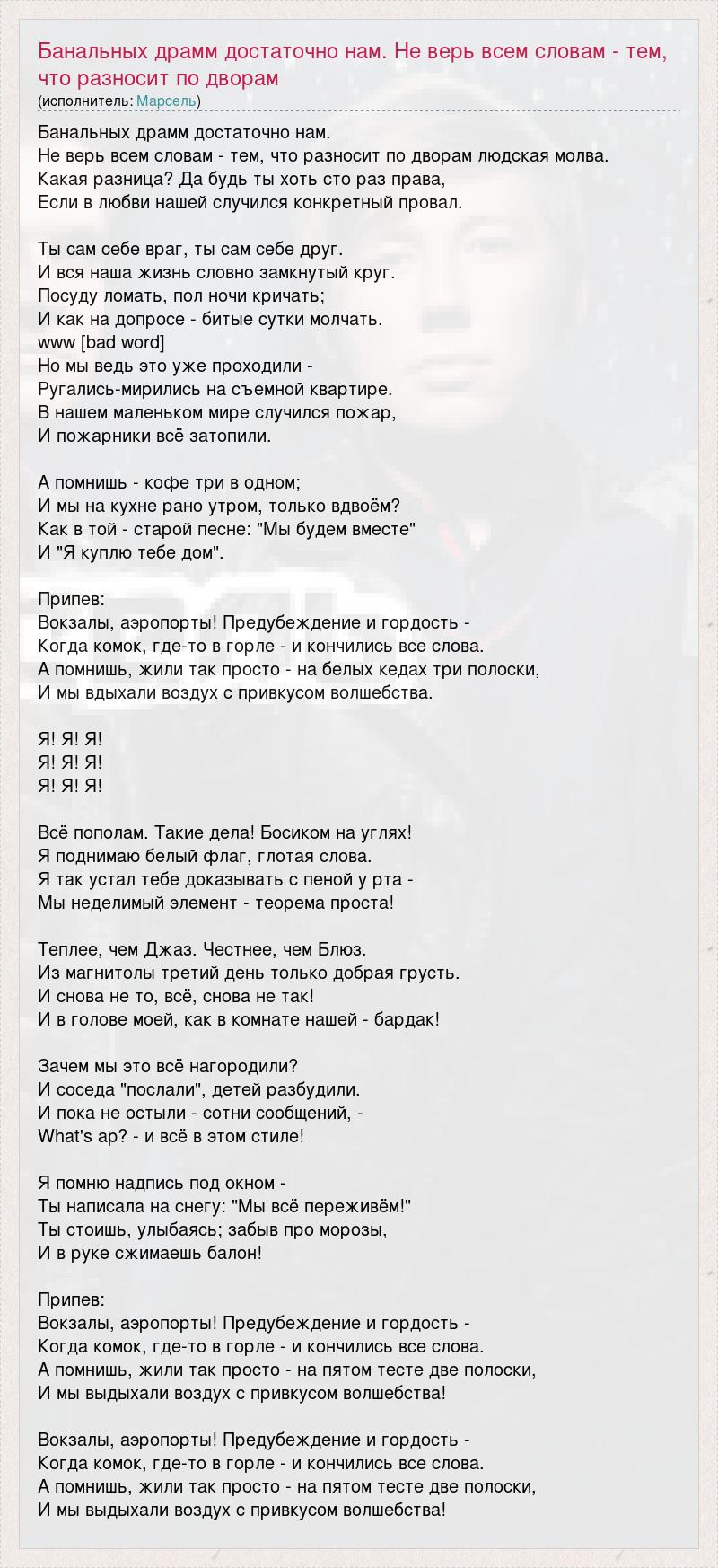 Банальных драмм достаточно нам. Не верь всем словам - тем, что разносит по дворам людская молва. Какая разница? Да будь ты хоть сто раз права, Если в любви нашей случился конкретный провал. Ты сам себе враг, ты сам себе друг. И вся наша жизнь словно замкнутый круг. Посуду ломать, пол ночи кричать; И как на допросе - битые сутки молчать. www [bad word] Но мы ведь это уже проходили - Ругались-мирились на съемной квартире. В нашем маленьком мире случился пожар, И пожарники всё затопили. А помнишь - кофе три в одном; И мы на кухне рано утром, только вдвоём? Как в той - старой песне: "Мы будем вместе" И "Я куплю тебе дом". Припев: Вокзалы, аэропорты! Предубеждение и гордость - Когда комок, где-то в горле - и кончились все слова. А помнишь, жили так просто - на белых кедах три полоски, И мы вдыхали воздух с привкусом волшебства. Я! Я! Я! Я! Я! Я! Я! Я! Я! Всё пополам. Такие дела! Босиком на углях! Я поднимаю белый флаг, глотая слова. Я так устал тебе доказывать с пеной у рта - Мы неделимый элемент - теорема проста! Теплее, чем Джаз. Честнее, чем Блюз. Из магнитолы третий день только добрая грусть. И снова не то, всё, снова не так! И в голове моей, как в комнате нашей - бардак! Зачем мы это всё нагородили? И соседа "послали", детей разбудили. И пока не остыли - сотни сообщений, - What's ap? - и всё в этом стиле! Я помню надпись под окном - Ты написала на снегу: "Мы всё переживём!" Ты стоишь, улыбаясь; забыв про морозы, И в руке сжимаешь балон! Припев: Вокзалы, аэропорты! Предубеждение и гордость - Когда комок, где-то в горле - и кончились все слова. А помнишь, жили так просто - на пятом тесте две полоски, И мы выдыхали воздух с привкусом волшебства! Вокзалы, аэропорты! Предубеждение и гордость - Когда комок, где-то в горле - и кончились все слова. А помнишь, жили так просто - на пятом тесте две полоски, И мы выдыхали воздух с привкусом волшебства!